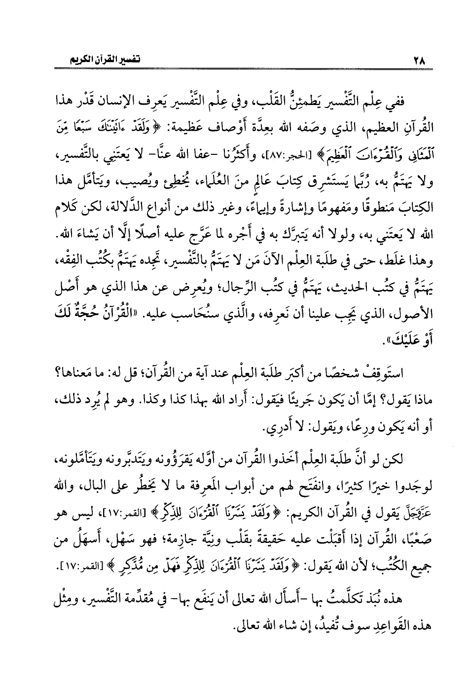 ففي عِلْم التَّفْسير يَطمئِنُّ القَلْب، وفي عِلْم التَّفْسير يَعرِف الإنسان قَدْر هذا القُرآنِ العظيم، الذي وصَفه الله بعِدَّة أَوْصاف عَظيمة: {وَلَقَدْ آتَيْنَاكَ سَبْعًا مِنَ الْمَثَانِي وَالْقُرْآنَ الْعَظِيمَ (٨٧)} [الحجر: ٨٧]، وأَكثَرُنا - عفا الله عنَّا - لا يَعتَنِي بالتَّفسير، ولا يَهتَمُّ به، رُبَّما يَستَشرِق كِتابَ عَالِمٍ منَ العُلَماء، يُخطِئ ويُصيب، ويَتأمَّل هذا الكِتابَ مَنطوقًا ومَفهومًا وإشارةً وإيماءً، وغير ذلك من أنواع الدَّلالة، لكن كَلام الله لا يَعتَني به، ولولا أنه يَتبرَّك به في أَجْره لما عَرَّج عليه أصلًا إلَّا أن يَشاءَ الله. وهذا غلَط، حتى في طلَبة العِلْم الآنَ مَن لا يَهتَمُّ بالتَّفْسير، تَجِده يَهتَمُّ بكُتُب الفِقْه، يَهتَمُّ في كتُب الحديث، يَهتَمُّ في كتُب الرِّجال؛ ويُعرِض عن هذا الذي هو أَصْل الأصول، الذي يَجِب علينا أن نَعرِفه، والَّذي سنُحَاسب عليه. "الْقُرْآنُ حُجَّةٌ لَكَ أَوْ عَلَيْكَ".