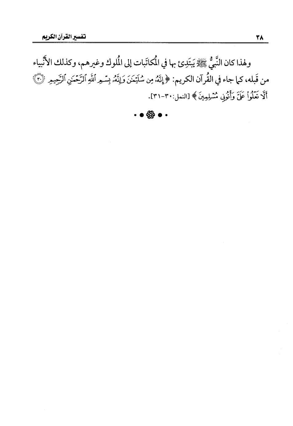 ولهذا كان النَّبيُّ - صلى الله عليه وسلم - يَبتَدِئ بها في المُكاتَبات إلى المُلوك وغيرهم، وكذلك الأَنْبياء من قَبله، كما جاء في القُرآن الكريم: {إِنَّهُ مِنْ سُلَيْمَانَ وَإِنَّهُ بِسْمِ اللَّهِ الرَّحْمَنِ الرَّحِيمِ (٣٠) أَلَّا تَعْلُوا عَلَيَّ وَأْتُونِي مُسْلِمِينَ} [النمل: ٣٠، ٣١].