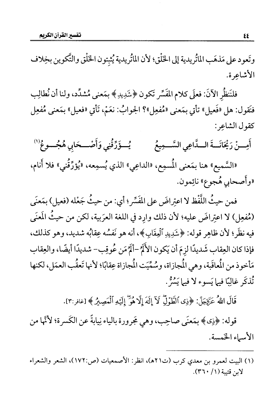 فمن حيثُ اللَّفْظ لا اعتِراضَ على المفَسِّر؛ أي: من حيثُ جَعْله (فعيل) بمَعنَى (مُفعِل) لا اعتِراضَ عليه؛ لأن ذلك وارِد في اللغة العرَبية، لكن من حيثُ المَعنَى فيه نظَر؛ لأن ظاهِر قوله: {شَدِيدِ الْعِقَابِ}، أنه هو نَفسُه عِقابُه شديد، وهو كذلك، فإذا كان العِقاب شَديدًا لزِمَ أن يَكون الأَلَمُ -ألَمُ مَن عُوقِب- شديدًا أيضًا، والعِقاب مَأخوذ من المُعاقَبة، وهي المُجازاة، وسُمِّيَت المُجازاة عِقابًا؛ لأنها تَعقُب العمَل، لكنها تُذكَر غالِبًا فيما يَسوء لا فيما يَسُرُّ.