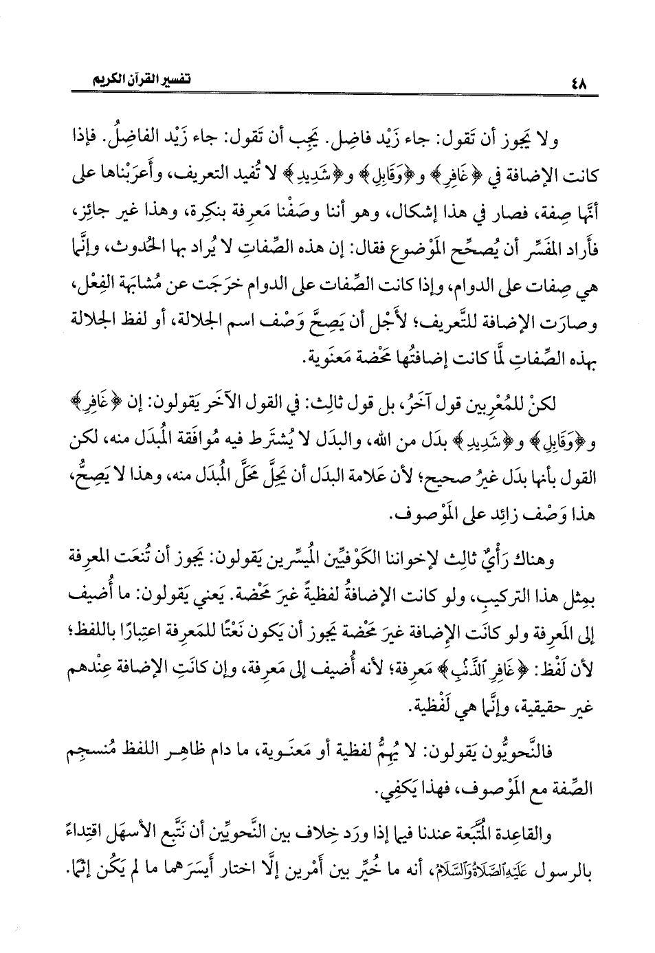 ولا يَجوز أن تَقول: جاء زَيْد فاضِل. يَجِب أن تَقول: جاء زَيْد الفاضِلُ. فإذا كانت الإضافة {غَافِرِ} و {وَقَابِلِ} و {شَدِيدِ}، في لا تُفيد التعريف، وأَعرَبْناها على أنَّها صِفة، فصار في هذا إشكال، وهو أننا وصَفْنا مَعرِفة بنكِرة، وهذا غير جائِز، فأَراد المفَسِّر أن يُصحِّح المَوْضوع فقال: إن هذه الصِّفاتِ لا يُراد بها الحُدوث، وإنَّما هي صِفات على الدوام، وإذا كانت الصِّفات على الدوام خرَجَت عن مُشابَهة الفِعْل، وصارَت الإضافة للتَّعريف؛ لأَجْل أن يَصِحَّ وَصْف اسم الجلالة، أو لفظ الجلالة بهذه الصِّفاتِ لمَّا كانت إضافتُها مَحْضة مَعنَوية.