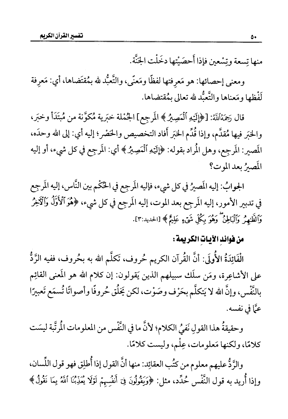الْفَائِدَةُ الأُولَى: أنَّ القُرآن الكريم حُروف، تَكلَّم الله به بحُروف، ففيه الرَّدُّ على الأشاعِرة، ومَن سلَك سبيلهم الذين يَقولون: إن كلام الله هو المَعنى القائِم بالنَّفْس، وإنَّ الله لا يَتكلَّم بحَرْف وصَوْت، لكن يَخلُق حُروفًا وأصواتًا تُسمَع تَعبيرًا عمَّا في نفسه.