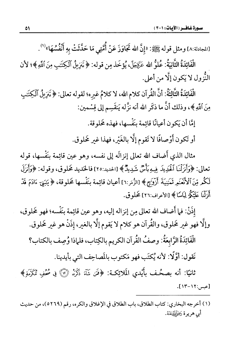 مثال الذي أَضاف الله تعالى إنزالَه إلى نفسه، وهو عين قائِمة بنَفْسها، قوله تعالى: {وَأَنْزَلْنَا الْحَدِيدَ فِيهِ بَأْسٌ شَدِيدٌ} [الحديد: ٢٥]، فالحَديد مَخْلوق، وقوله: {وَأَنْزَلَ لَكُمْ مِنَ الْأَنْعَامِ ثَمَانِيَةَ أَزْوَاجٍ} [الزمر: ٦]، أعيان قائِمة بنَفْسها مَخْلوقة، {يَابَنِي آدَمَ قَدْ أَنْزَلْنَا عَلَيْكُمْ لِبَاسًا} [الأعراف: ٢٦]، مَخْلوق.