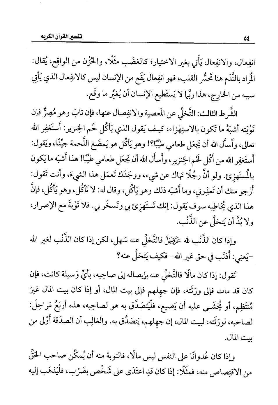 الشَّرط الثالث: التَّخلِّي عن المَعصية والانفِصال عنها، فإن تابَ وهو مُصِرٌّ فإن تَوْبَته أشبَهُ ما تَكون بالاستِهْزاء، كيف يَقول الذي يَأكُل لحم الخِنزير: أَستَغفِر الله تعالى، وأَسأَل الله أن يَجعَل طعامي طيِّبًا؟ ! وهو يَأكُل هو يَمضَغ اللَّحمة جيِّدًا، وَيقول: أَستَغفِر الله من أَكْل لحم الخِنزير، وأَسأَل الله أن يَجعَل طعامي طيِّبًا! هذا أَشبَه ما يَكون بالمُستَهزِئ. ولو أنَّ رجُلًا نَهاك عن شيء، ووجَدَك تَعمَل هذا الشيءَ، وأنت تَقول: أَرْجو منك أن تَعذِرني، وما أَشبَه ذلك وهو يَأكُل، وقال له: لا تَأكُل، وهو يَأكُل، فإنَّ هذا الذي يُخاطِبه سوف يَقول: إنَّك تَستَهزِئ بي وتَسخَر بي. فلا تَوْبةَ مع الإصرار، ولا بُدَّ أن يَتخلَّى عن الذَّنْب.