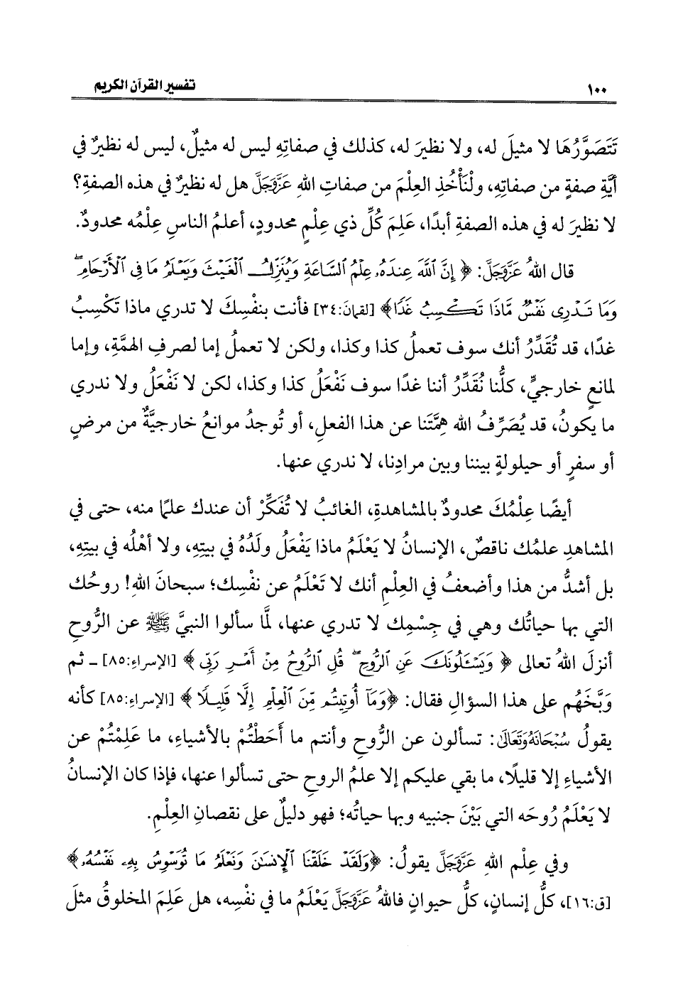 أيضًا عِلْمُكَ محدودٌ بالمشاهدةِ، الغائبُ لا تُفَكِّرْ أن عندك علمًا منه، حتى في المشاهدِ علمُك ناقصٌ، الإنسانُ لا يَعْلَمُ ماذا يَفْعَلُ ولَدُهُ في بيتِهِ، ولا أهْلُه في بيتِهِ، بل أشدُّ من هذا وأضعفُ في العِلْمِ أنك لا تَعْلَمُ عن نفْسِك؛ سبحانَ اللهِ! روحُك التي بها حياتُك وهي في جِسْمِك لا تدري عنها، لمَّا سألوا النبيَّ - صلى الله عليه وسلم - عن الرُّوحِ ألْرْلَ اللهُ تعالى {وَيَسْأَلُونَكَ عَنِ الرُّوحِ قُلِ الرُّوحُ مِنْ أَمْرِ رَبِّي} [الإسراء: ٨٥]- ثم وَبَّخَهُم على هذا السؤالِ فقال: {وَمَا أُوتِيتُمْ مِنَ الْعِلْمِ إِلَّا قَلِيلًا} [الإسراء: ٨٥] كأنه يقولُ سُبْحَانَهُ وَتَعَالَى: تسألون عن الرُّوحِ وأنتم ما أَحَطْتُمْ بالأشياءِ، ما عَلِمْتُمْ عن الأشياءِ إلا قليلًا، ما بقي عليكم إلا علمُ الروحِ حتى تسألوا عنها، فإذا كان الإنسانُ لا يَعْلَمُ رُوحَه التي بَيْنَ جنبيه وبها حياتُه؛ فهو دليلٌ على نقصانِ العِلْمِ.