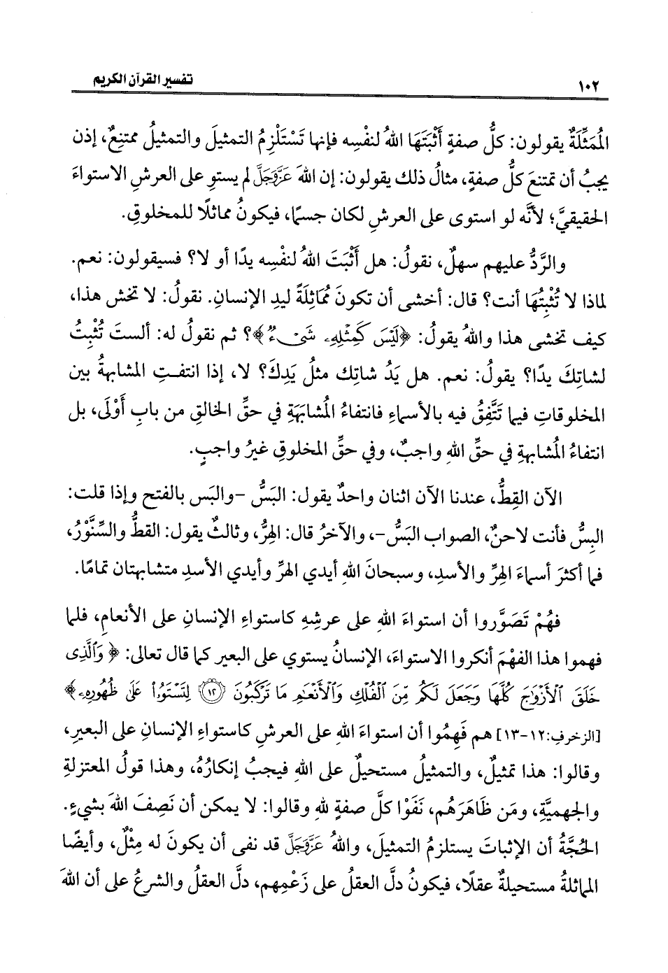 فهُمْ تَصَوَّروا أن استواءَ اللهِ على عرشِهِ كاستواءِ الإنسانِ على الأنعامِ، فلما فهموا هذا الفهْمَ أنكروا الإستواءَ، الإنسانُ يستوي على البعير كما قال تعالى: {وَالَّذِي خَلَقَ الْأَزْوَاجَ كُلَّهَا وَجَعَلَ لَكُمْ مِنَ الْفُلْكِ وَالْأَنْعَامِ مَا تَرْكَبُونَ (١٢) لِتَسْتَوُوا عَلَى ظُهُورِهِ} [الزخرفِ: ١٢ - ١٣] هم فَهِمُوا أن استواءَ اللهِ على العرشِ كاستواءِ الإنسانِ على البعيرِ، وقالوا: هذا تمثيلٌ، والتمثيلُ مستحيلٌ على اللهِ فيجبُ إنكارُهُ، وهذا قولُ المعتزلةِ والجهميَّةِ، ومَن ظَاهَرَهُم، نَفَوْا كلَّ صفةٍ للهِ وقالوا: لا يمكن أن نَصِفَ اللهَ بشيءٍ. الحُجَّةُ أن الإثباتَ يستلزمُ التمثيلَ، واللهُ عَزَّ وَجَلَّ قد نفى أن يكونَ له مِثْلٌ، وأيضًا المماثلةُ مستحيلةٌ عقلًا، فيكونُ دلَّ العقلُ على زَعْمِهم، دلَّ العقلُ والشرعُ على أن اللهَ