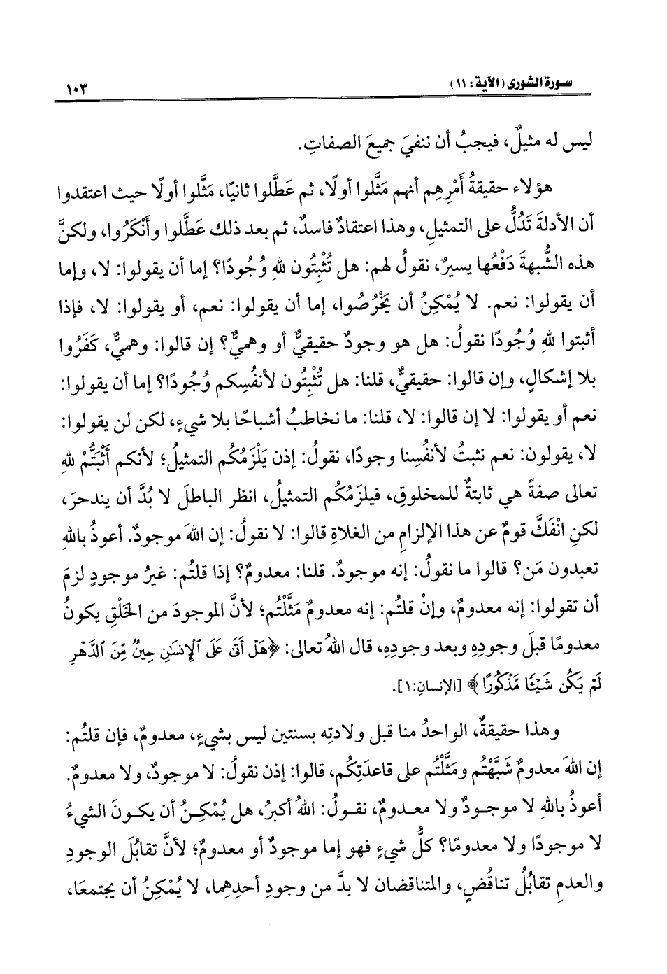 هؤلاء حقيقةُ أَمْرِهِم أنهم مَثَّلوا أولًا، ثم عَطَّلوا ثانيًا، مَثَّلوا أولًا حيث اعتقدوا أن الأدلةَ تَدُلُّ على التمثيلِ، وهذا اعتقادٌ فاسدٌ، ثم بعد ذلك عَطَّلوا وأَنْكَرُوا، ولكنَّ هذه الشُّبهةَ دَفْعُها يسيرٌ، نقولُ لهم: هل تُثْبِتُون للهِ وُجُودًا؟ إما أن يقولوا: لا، وإما أن يقولوا: نعم. لا يُمْكِنُ أن يَخْرُصُوا، إما أن يقولوا: نعم، أو يقولوا: لا، فإذا أثبتوا للهِ وُجُودًا نقولُ: هل هو وجودٌ حقيقيٌّ أو وهميٌّ؟ إن قالوا: وهميٌّ، كَفَرُوا بلا إشكالٍ، وإن قالوا: حقيقيٌّ، قلنا: هل تُثْبِتُون لأنفُسِكم وُجُودًا؟ إما أن يقولوا: نعم أو يقولوا: لا إن قالوا: لا، قلنا: ما نخاطبُ أشباحًا بلا شيءٍ، لكن لن يقولوا: لا، يقولون: نعم نثبتُ لأنفُسِنا وجودًا، نقولُ: إذن يَلْزَمُكُم التمثيلُ؛ لأنكم أَثْبَتُّمْ للهِ تعالى صفةً هي ثابتةٌ للمخلوقِ، فيلزَمُكُم التمثيلُ، انظر الباطلَ لا بُدَّ أن يندحرَ، لكنِ انْفَكَّ قومٌ عن هذا الإلزامِ من الغلاةِ قالوا: لا نقولُ: إن اللهَ موجودٌ. أعوذُ باللهِ تعبدون مَن؟ قالوا ما نقولُ: إنه موجودٌ. قلنا: معدومٌ؟ إذا قلتُم: غيرُ موجودٍ لزمَ أن تقولوا: إنه معدومٌ، وإنْ قلتُم: إنه معدومٌ مَثَّلْتُم؛ لأنَّ الموجودَ من الخَلْقِ يكونُ معدومًا قبلَ وجودِهِ وبعد وجودِهِ، قال اللهُ تعالى: {هَلْ أَتَى عَلَى الْإِنْسَانِ حِينٌ مِنَ الدَّهْرِ لَمْ يَكُنْ شَيْئًا مَذْكُورًا} [الإنسانِ: ١].