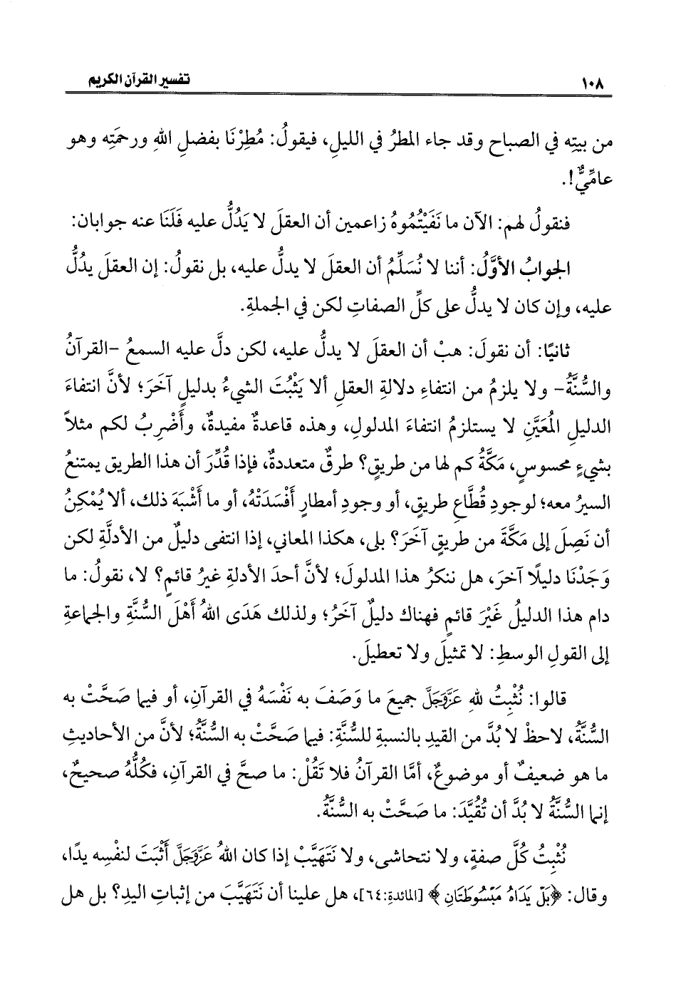 ثانيًا: أن نقولَ: هبْ أن العقلَ لا يدلُّ عليه، لكن دلَّ عليه السمعُ - القرآنُ والسُّنَّةُ - ولا يلزمُ من انتفاءِ دلالةِ العقلِ ألا يَثْبُتَ الشيءُ بدليلٍ آخَرَ؛ لأنَّ انتفاءَ الدليلِ المُعَيَّنِ لا يستلزمُ انتفاءَ المدلولِ، وهذه قاعدةٌ مفيدةٌ، وأَضْرِبُ لكم مثلًا بشيءٍ محسوسٍ، مَكَّةُ كم لها من طريقٍ؟ طرقٌ متعددةٌ، فإذا قُدِّرَ أن هذا الطريق يمتنعُ السيرُ معه؛ لوجودِ قُطَّاعِ طريقٍ، أو وجودِ أمطارٍ أَفْسَدَتْهُ، أو ما أَشْبَهَ ذلك، ألا يُمْكِنُ أن نَصِلَ إلى مَكَّةَ من طريقٍ آخَرَ؟ بلى، هكذا المعاني، إذا انتفى دليلٌ من الأدلَّةِ لكن وَجَدْنَا دليلًا آخرَ، هل ننكرُ هذا المدلولَ؛ لأنَّ أحدَ الأدلةِ غيرُ قائمٍ؟ لا، نقولُ: ما دام هذا الدليلُ غَيْرَ قائمٍ فهناك دليلٌ آخَرُ؛ ولذلك هَدَى اللهُ أَهْلَ السُّنَّةِ والجماعةِ إلى القولِ الوسطِ: لا تمثيلَ ولا تعطيلَ.
