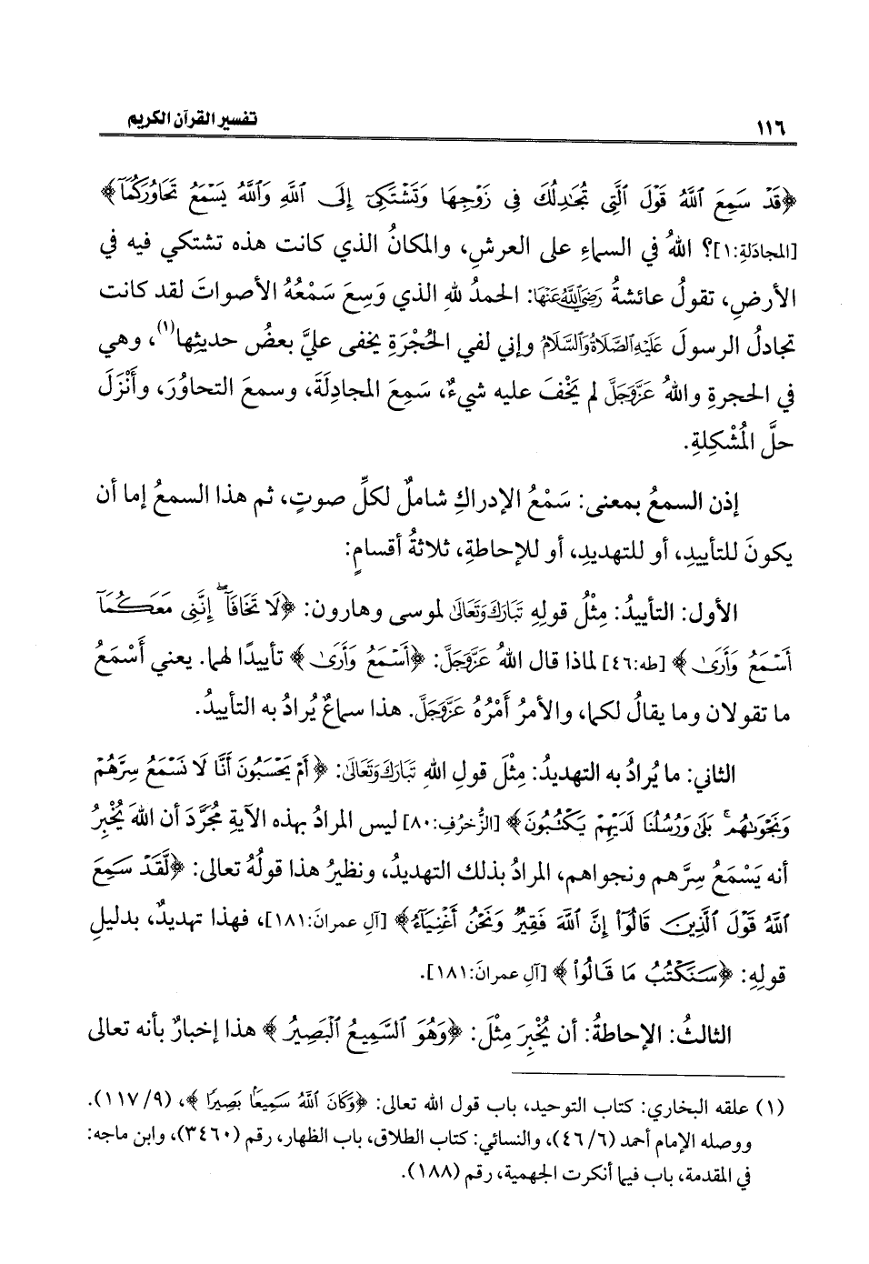 (¬١) علقه البخاري: كتاب التوحيد، باب قول الله تعالى: {وَكَانَ اللَّهُ سَمِيعًا بَصِيرًا}، (٩/ ١١٧). ووصله الإمام أحمد (٦/ ٤٦)، والنسائي: كتاب الطلاق، باب الظهار، رقم (٣٤٦٠)، وابن ماجه: في المقدمة، باب فيما أنكرت الجهمية، رقم (١٨٨).