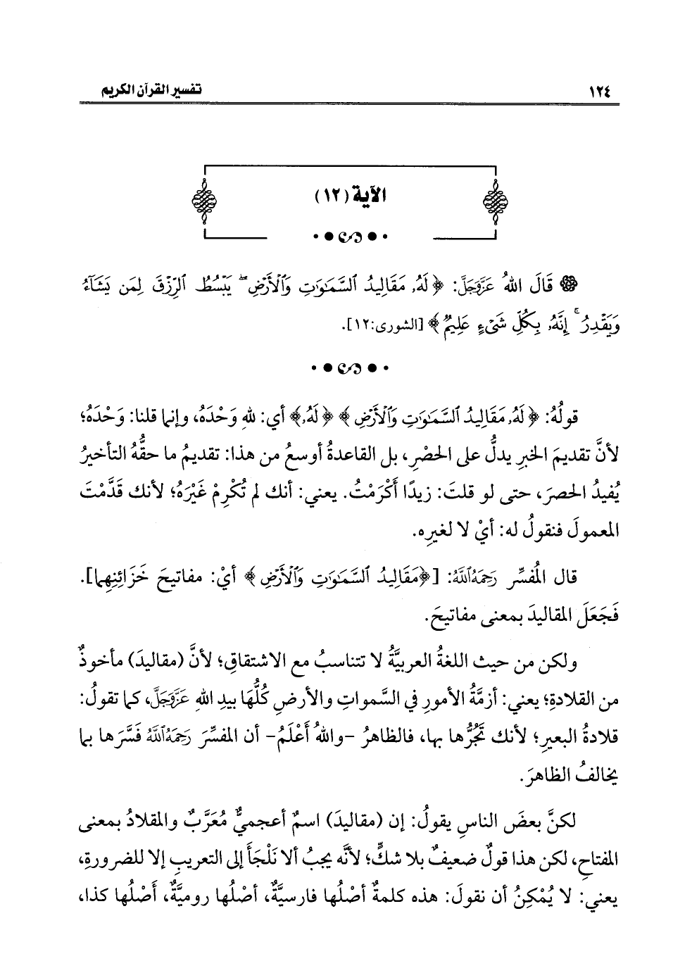 ولكن من حيث اللغةُ العربيَّةُ لا تتناسبُ مع الإشتقاقِ؛ لأنَّ (مقاليدَ) مأخوذٌ من القلادةِ؛ يعني: أزمَّةُ الأمورِ في السَّمواتِ والأرضِ كُلُّهَا بيدِ اللهِ عَزَّ وَجَلَّ، كما تقولُ: قلادةُ البعيرِ؛ لأنك تَجُرُّها بها، فالظاهرُ - واللهُ أَعْلَمُ - أن المفسِّرَ رَحِمَهُ اللَّهُ فَسَّرَها بما يخالفُ الظاهرَ.