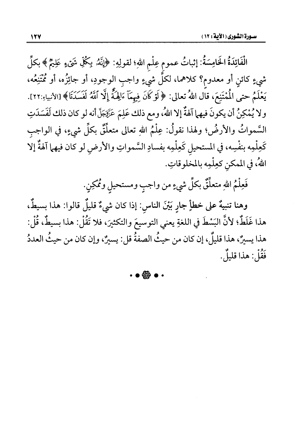 الْفَائِدَةُ الخَامِسَةُ: إثباتُ عمومِ عِلْمِ اللهِ؛ لقولِهِ: {إِنَّهُ بِكُلِّ شَيْءٍ عَلِيمٌ} بكلِّ شيءٍ كائنٍ أو معدومٍ؟ كلاهما، لكَلِّ شيءٍ واجبِ الوجودِ، أو جائِزُه، أو مُمْتَنِعُه، يَعْلَمُ حتى المُمْتَنِعَ، قال اللهُ تعالى: {لَوْ كَانَ فِيهِمَا آلِهَةٌ إِلَّا اللَّهُ لَفَسَدَتَا} [الأنبياءِ: ٢٢]. ولا يُمْكِنُ أن يكونَ فيهما آلهةٌ إلا اللهُ، ومع ذلك عَلِمَ عَزَّ وَجَلَّ أنه لو كان ذلك لَفَسَدَتِ السَّمواتُ والأرضُ؛ ولهذا نقولُ: عِلْمُ اللهِ تعالى متعلِّقٌ بكلِّ شيءٍ، في الواجبِ كَعِلْمِه بنفْسِه، في المستحيلِ كَعِلْمِه بفسادِ السَّمواتِ والأرضِ لو كان فيهما آلهةٌ إلا اللهُ، في الممكنِ كعِلْمِه بالمخلوقاتِ.