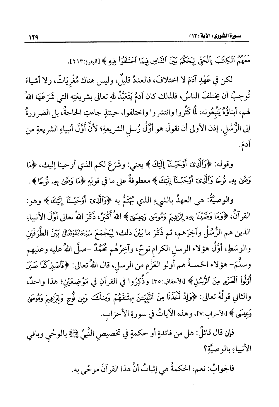 والوصيَّةُ: هي العهدُ بالشيءِ الذي يُهْتَمُّ به {وَالَّذِي أَوْحَيْنَا إِلَيْكَ} وهو: القرآنُ، {وَمَا وَصَّيْنَا بِهِ إِبْرَاهِيمَ وَمُوسَى وَعِيسَى} اللهُ أَكْبَرُ، ذَكَرَ اللهُ تعالى أوَّلَ الأنبياءِ الذين هم الرُّسُلُ وآخِرَهم، ثم ذَكَرَ ما بَيْنَ ذلك؛ لِيَجْمَعَ سُبْحَانَهُ وَتَعَالَى بَيْنَ الطَّرَفَيْنِ والوسَطِ، أوَّلُ هؤلاء الرسلِ الكرامِ نوحٌ، وآخِرُهُم مُحَمَّدٌ - صلَّى اللهُ عَلَيْهِ وعليهم وسلَّمَ - هؤلاء الخمسةُ هم أولو العَزْمِ من الرسلِ، قال اللهُ تعالى: {فَاصْبِرْ كَمَا صَبَرَ أُولُو الْعَزْمِ مِنَ الرُّسُلِ} [الأحقافِ: ٣٥] وذُكِرُوا في القرآنِ في مَوْضِعَيْنِ؛ هذا واحدٌ، والثاني قولُهُ تعالى: {وَإِذْ أَخَذْنَا مِنَ النَّبِيِّينَ مِيثَاقَهُمْ وَمِنْكَ وَمِنْ نُوحٍ وَإِبْرَاهِيمَ وَمُوسَى وَعِيسَى} [الأحزابِ: ٧]، وهذه الآياتُ في سورةِ الأحزابِ.
