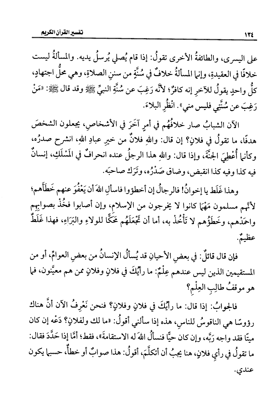 على اليسرى، والطائفةُ الأخرى تقولُ: إذا قام يُصلي يُرسلُ يديه. والمسألةُ ليست خلافًا في العقيدةِ، وإنما المسألةُ خلافٌ في سُنَّةٍ من سننِ الصلاةِ، وهي محلُّ اجتهادٍ، كلُّ واحدٍ يقولُ للآخرِ إنه كافرٌ؛ لأنَّه رَغِبَ عن سُنَّةِ النبيِّ - صلى الله عليه وسلم - وقد قال - صلى الله عَلَيْهِ وسلم -: "مَنْ رَغِبَ عن سُنَّتِي فليس مني". انْظُرِ البلاءَ.