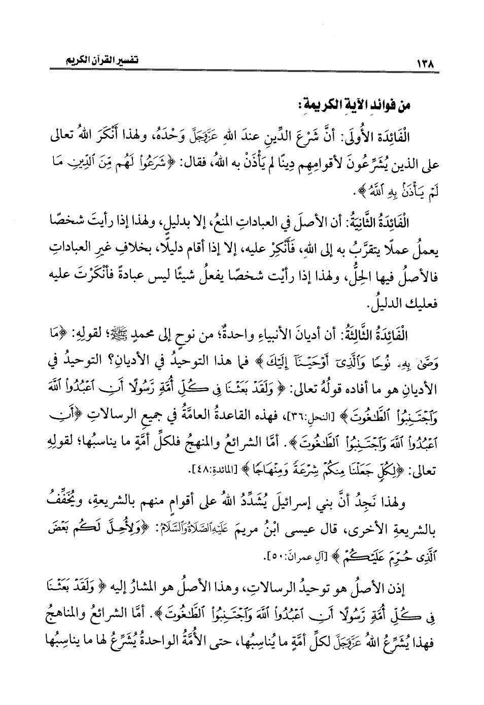 الْفَائِدَة الأُولَى: أنَّ شَرْعَ الدِّينِ عندَ اللهِ عَزَّ وَجَلَّ وَحْدَهُ، ولهذا أَنْكَرَ اللهُ تعالى على الذين يُشَرِّعُونَ لأقوامِهِم دِينًا لم يَأْذَنْ به اللهُ، فقال: {شَرَعُوا لَهُمْ مِنَ الدِّينِ مَا لَمْ يَأْذَنْ بِهِ اللَّهُ}.