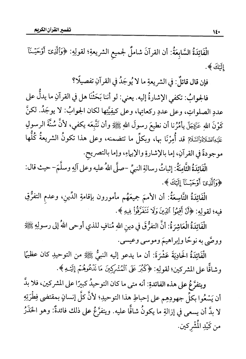 الْفَائِدَةُ السَّابِعَةُ: أن القرآنَ شاملٌ لجميعِ الشريعةِ؛ لقولِهِ: {وَالَّذِي أَوْحَيْنَا إِلَيْكَ}.