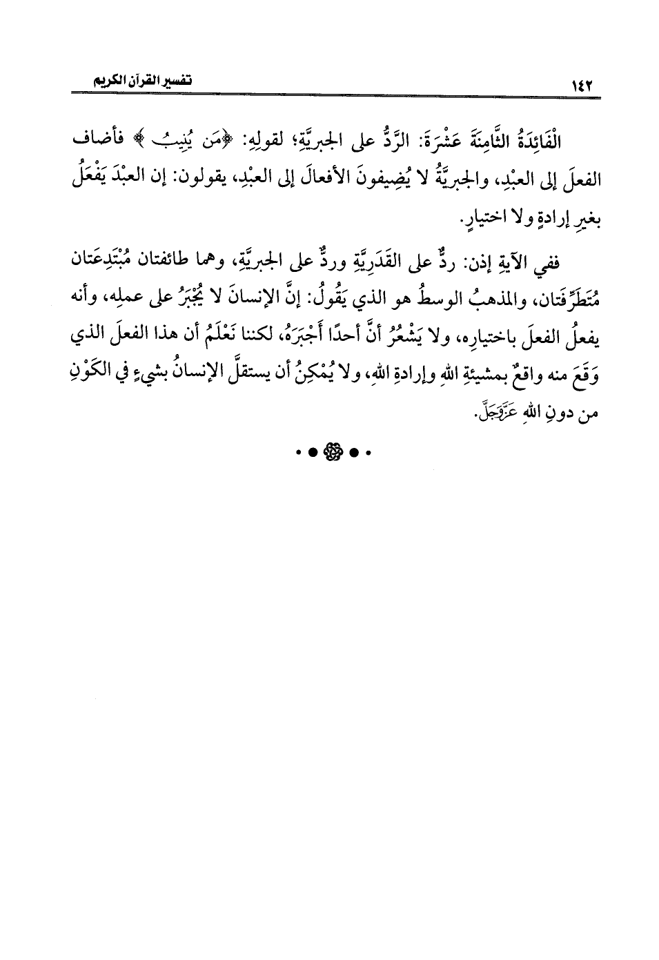 ففي الآيةِ إذن: ردٌّ على القَدَريَّةِ وردٌّ على الجبريَّةِ، وهما طائفتان مُبْتَدِعَتان مُتَطَرِّفَتان، والمذهبُ الوسطُ هو الذي يَقُولُ: إنَّ الإنسانَ لا يُجْبَرُ على عملِه، وأنه يفعلُ الفعلَ باختيارِه، ولا يَشْعُرُ أنَّ أحدًا أَجْبَرَهُ، لكننا نَعْلَمُ أن هذا الفعلَ الذي وَقَعَ منه واقعٌ بمشيئةِ اللهِ وإرادةِ اللهِ، ولا يُمْكِنُ أن يستقلَّ الإنسانُ بشيءٍ في الكَوْنِ من دونِ اللهِ عَزَّ وَجَلَّ.