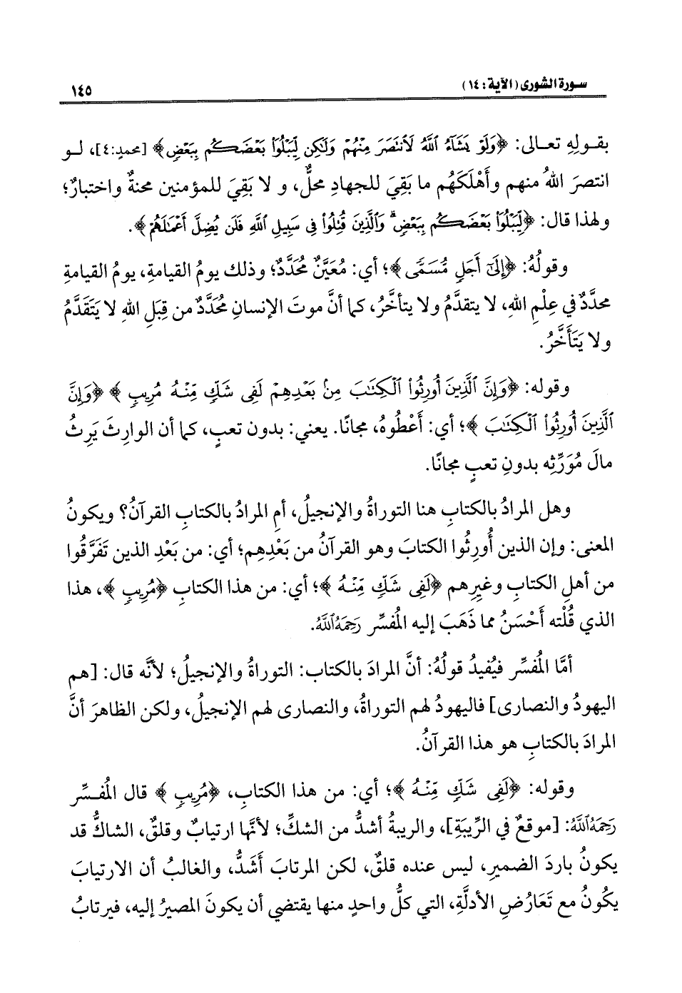 وهل المرادُ بالكتابِ هنا التوراةُ والإنجيلُ، أمِ المرادُ بالكتابِ القرآنُ؟ ويكونُ المعنى: وإن الذين أُورِثُوا الكتابَ وهو القرآنُ من بَعْدِهِم؛ أي: من بَعْدِ الذين تَفَرَّقُوا من أهلِ الكتابِ وغيِرِهم {لَفِي شَكٍّ مِنْهُ}؛ أي: من هذا الكتابِ {مُرِيبٍ} , هذا الذي قُلْته أَحْسَنُ مما ذَهَبَ إليه المُفسِّر رَحِمَهُ اللَّهُ.