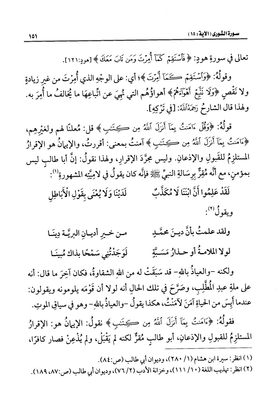 قولُهُ: {وَقُلْ آمَنْتُ بِمَا أَنْزَلَ اللَّهُ مِنْ كِتَابٍ} قل: مُعلنًا لهم ولغيْرِهِم، {آمَنْتُ بِمَا أَنْزَلَ اللَّهُ مِنْ كِتَابٍ} آمنتُ بمعنى: أقررتُ، والإيمانُ هو الإقرارُ المستلزِمُ للقَبولِ والإذعانِ. وليس مجرَّدَ الإقرارِ، ولهذا نقولُ: إنَّ أبا طالبٍ ليس بمؤمنٍ، مع أنَّه مُقِرٌّ بِرِسَالةِ النبيِّ - صلى الله عليه وسلم - فإنَّه كان يقولُ في لامِيَّتِه المشهورةِ (¬١):
