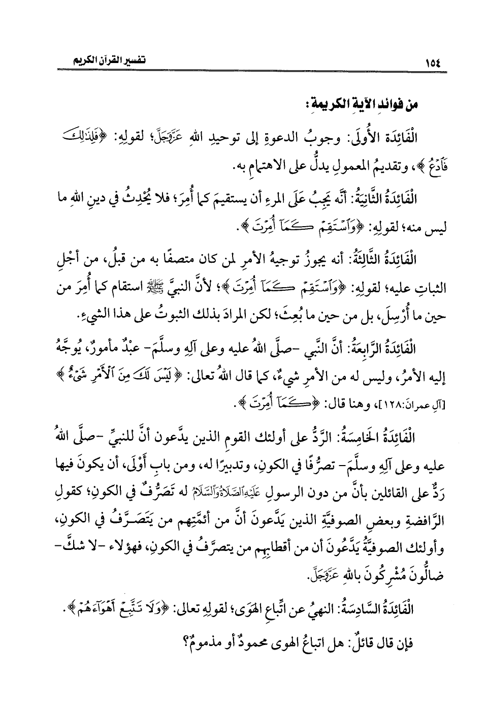 الْفَائِدَةُ الثَّانِيَةُ: أَنَّه يَجِبُ عَلَى المرءِ أن يستقيمَ كما أُمِرَ؛ فلا يُحْدِثُ في دينِ اللهِ ما ليس منه؛ لقولِهِ: {وَاسْتَقِمْ كَمَا أُمِرْتَ}.