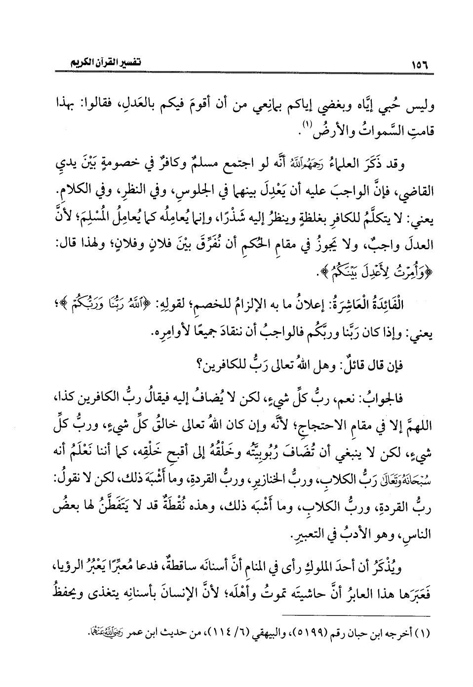 وقد ذَكَرَ العلماءُ رَحَمَهُم اللَّهُ أَنَّه لو اجتمع مسلمٌ وكافرٌ في خصومةٍ بَيْنَ يديِ القاضي، فإنَّ الواجبَ عَلَيْهِ أن يَعْدِلَ بينهما في الجلوسِ، وفي النظرِ، وفي الكلامِ. يعني: لا يتكلَّمُ للكافرِ بغلظةٍ وينظرُ إليه شَذْرًا، وإنما يُعامِلُه كما يُعامِلُ المُسْلِمَ؛ لأنَّ العدلَ واجبٌ، ولا يَجوزُ في مقامِ الحُكمِ أن نُفَرِّقَ بيْنَ فلانٍ وفلانٍ؛ ولهذا قال: {وَأُمِرْتُ لِأَعْدِلَ بَيْنَكُمُ}.