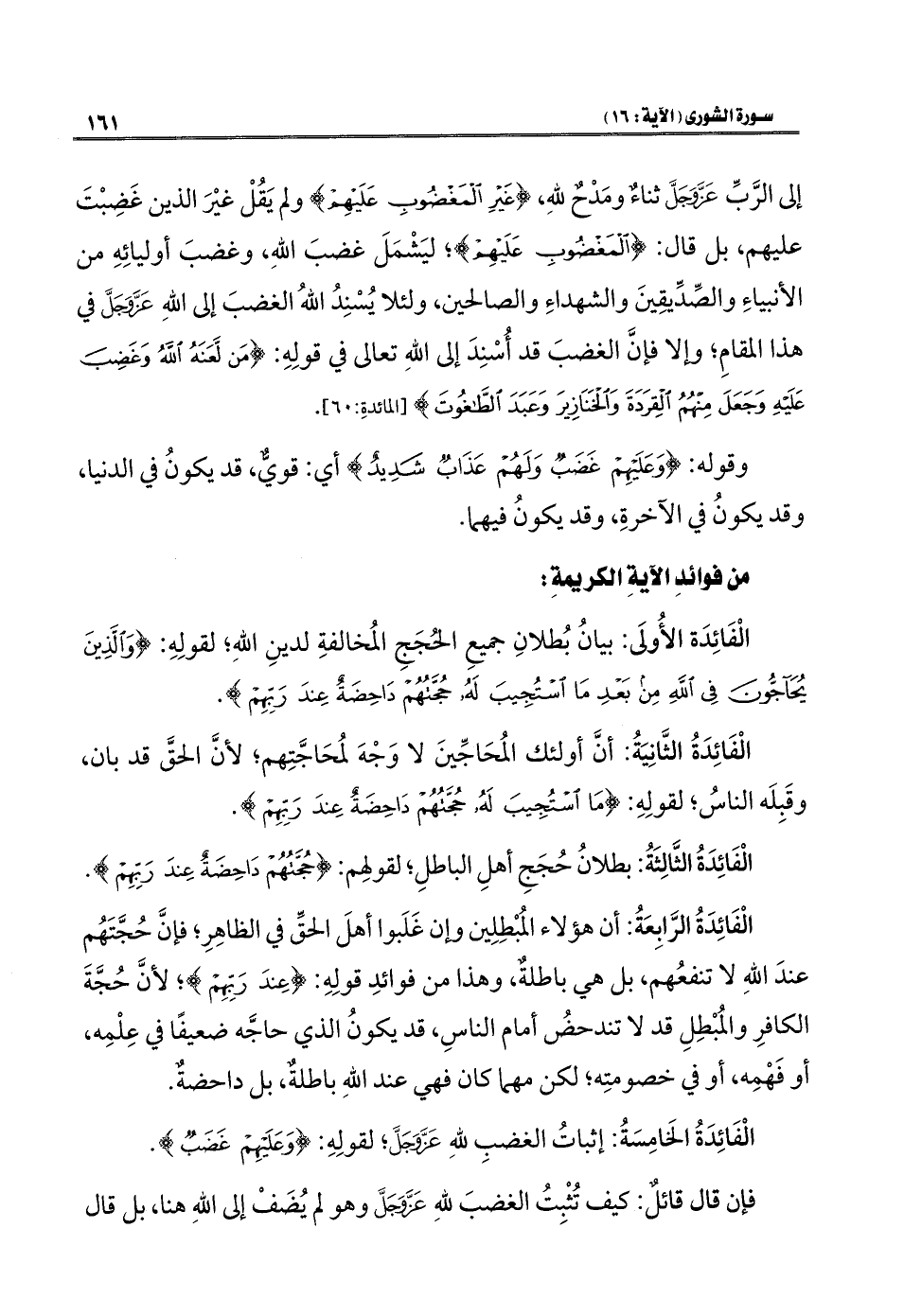 الْفَائِدَة الأُولَى: بيانُ بُطلانِ جميعِ الحُجَجِ المُخالفةِ لدينِ اللهِ، لقولِهِ: {وَالَّذِينَ يُحَاجُّونَ فِي اللَّهِ مِنْ بَعْدِ مَا اسْتُجِيبَ لَهُ حُجَّتُهُمْ دَاحِضَةٌ عِنْدَ رَبِّهِمْ}.