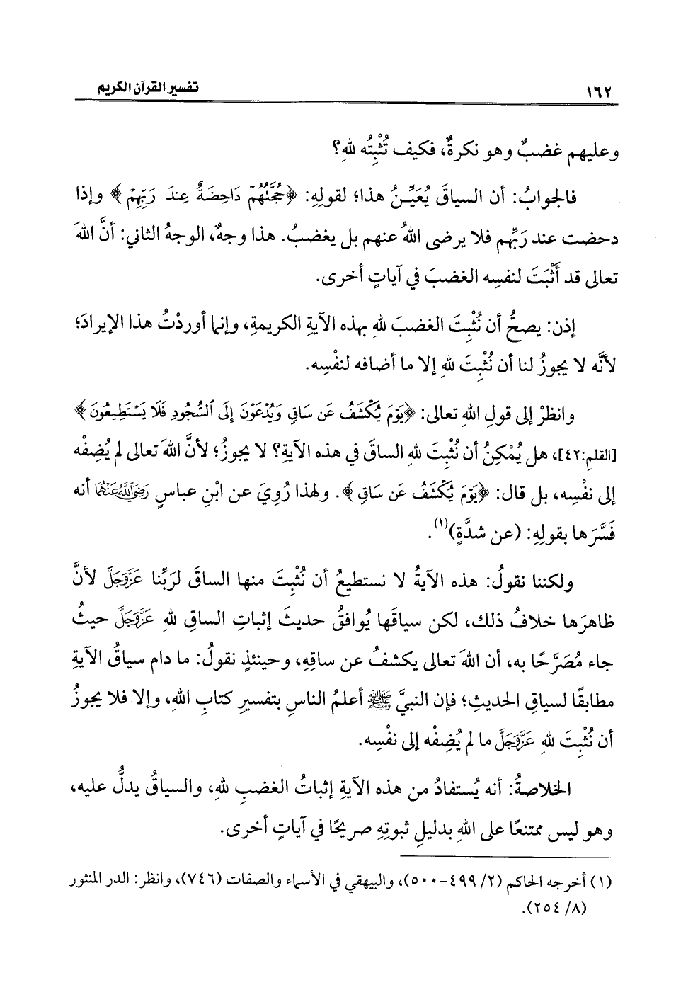 ولكننا نقولُ: هذه الآيةُ لا نستطيعُ أن نُثْبِتَ منها الساقَ لرَبِّنا عَزَّ وَجَلَّ لأنَّ ظاهرَها خلافُ ذلك، لكن سياقَها يُوافقُ حديثَ إثباتِ الساقِ للهِ عَزَّ وَجَلَّ حيثُ جاء مُصَرَّحًا به، أن اللهَ تعالى يكشفُ عن ساقِهِ، وحينئذٍ نقولُ: ما دام سياقُ الآيةِ مطابقًا لسياقِ الحديثِ؛ فإن النبيَّ - صلى الله عليه وسلم - أعلمُ الناسِ بتفسيرِ كتابِ اللهِ، وإلا فلا يجوزُ أن نُثْبِتَ للهِ عَزَّ وَجَلَّ ما لم يُضِفْه إلى نفْسِه.
