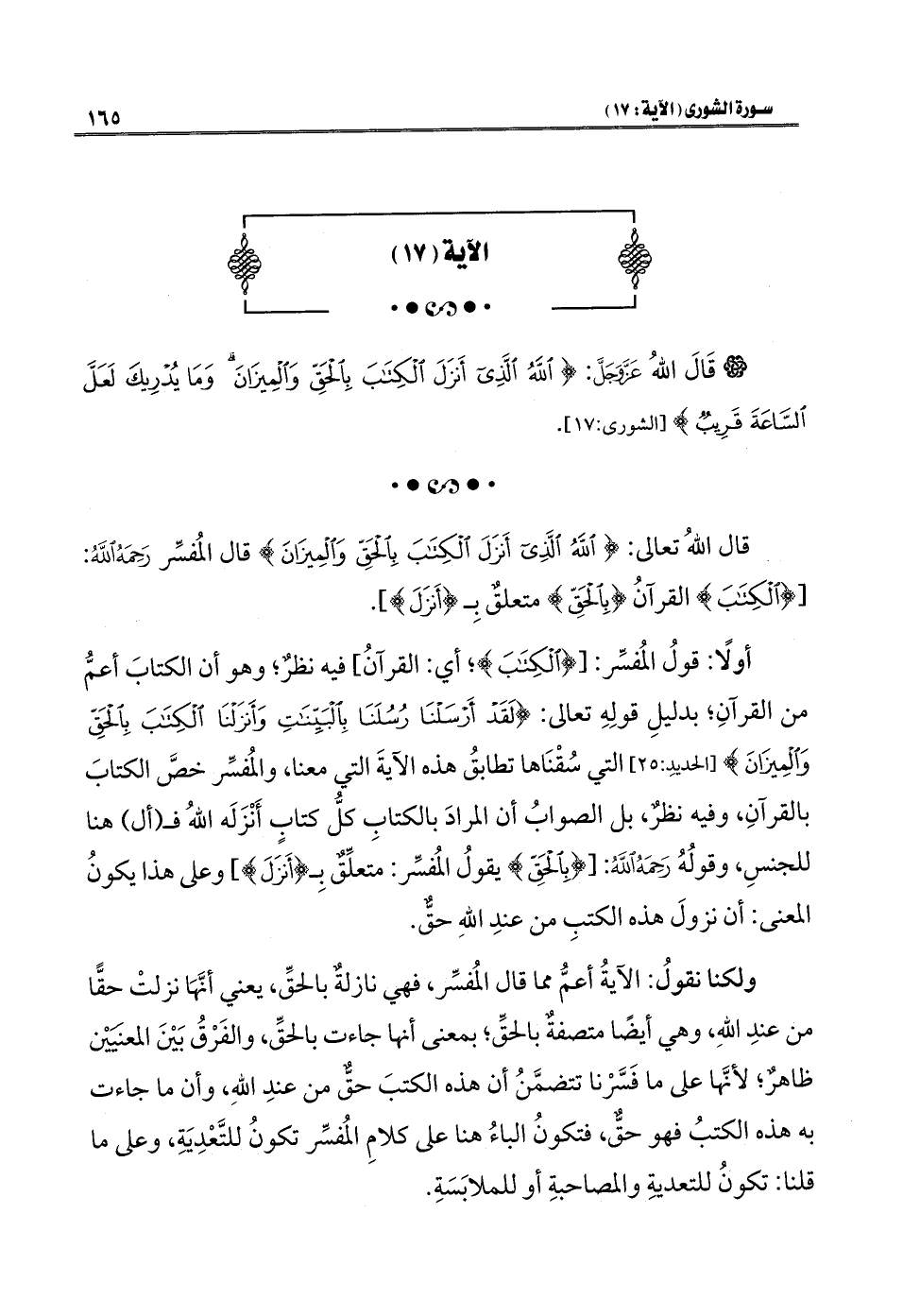 قال اللهُ تعالى: {اللَّهُ الَّذِي أَنْزَلَ الْكِتَابَ بِالْحَقِّ وَالْمِيزَانَ} قال المُفسِّر رَحِمَهُ اللَّهُ: [{الْكِتَابَ} القرآنُ {بِالْحَقِّ} متعلق بِـ {أَنْزَلَ}].