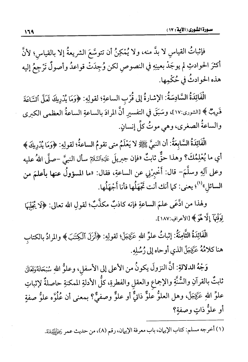 الْفَائِدَةُ السَّادِسَةُ: الإشارةُ إلى قُرْبِ الساعةِ؛ لقولِهِ: {وَمَا يُدْرِيكَ لَعَلَّ السَّاعَةَ قَرِيبٌ} [الشورى: ١٧]، وسَبَقَ في التفسيرِ أنَّ المرادَ بالساعةِ الساعةُ العظمى الكبرى والساعةُ الصغرى، وهي موتُ كلِّ إنسانٍ.