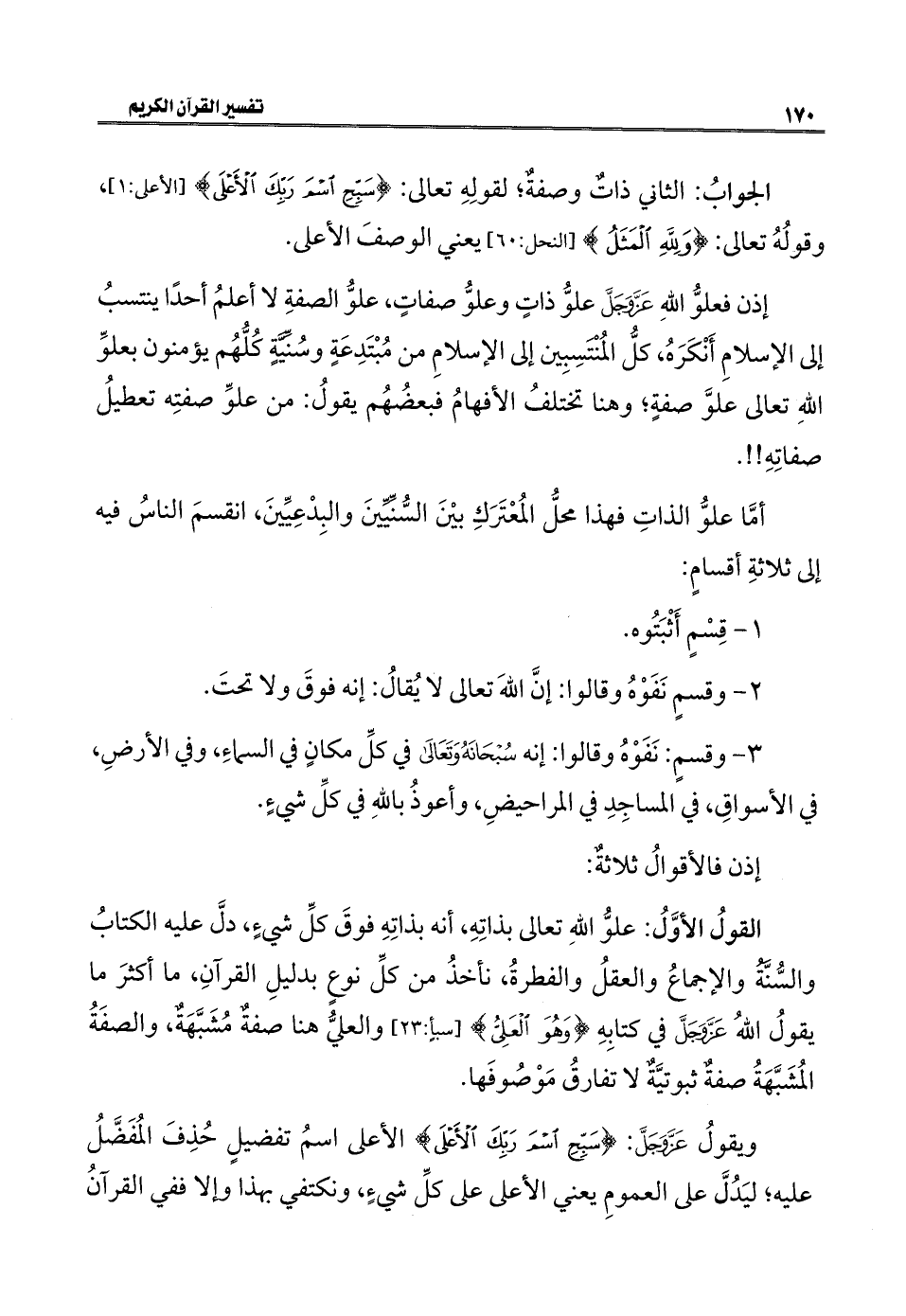 القولُ الأوَّلُ: علوُّ اللهِ تعالى بذاتِهِ، أنه بذاتِهِ فوقَ كلِّ شيءٍ، دلَّ عَلَيْهِ الكتابُ والسُّنَّةُ والإجماعُ والعقلُ والفطرةُ، نأخذُ من كلِّ نوعٍ بدليلِ القرآنِ، ما أكثرَ ما يقولُ اللهُ عَزَّ وَجَلَّ في كتابِهِ {وَهُوَ الْعَلِيُّ} [سبأ: ٢٣] والعليُّ هنا صفةٌ مُشَبَّهَةٌ، والصفَةُ المُشَبَّهَةُ صفةٌ ثبوتيَّةٌ لا تفارقُ مَوْصُوفَها.