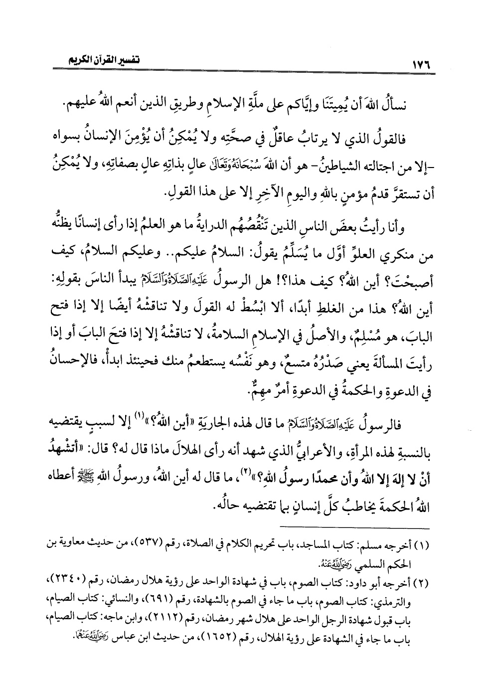 فالرسولُ عَلَيْهِ الصَّلَاةُ وَالسَّلَامُ ما قال لهذه الجارَيةِ "أين اللهُ؟ " (¬١) إلا لسببٍ يقتضيه بالنسبةِ لهذه المرأةِ، والأعرابيُّ الذي شهد أنه رأى الهلالَ ماذا قال له؟ قال: "أتشْهدُ أنْ لا إلهَ إلا اللهُ وأن محمدًا رسولُ اللهِ؟ " (¬٢)، ما قال له أين اللهُ، ورسولُ اللهِ - صلى الله عليه وسلم - أعطاه اللهُ الحكمةَ يخاطبُ كلَّ إنسانٍ بما تقتضيه حالُه.