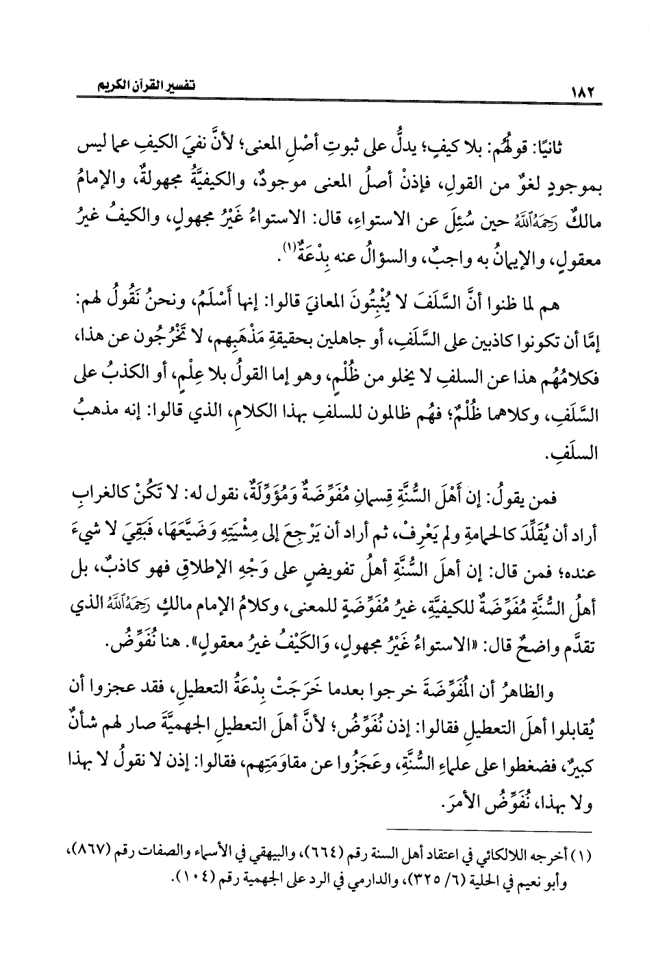 ثانيًا: قولُهُم: بلا كيفٍ؛ يدلُّ على ثبوتِ أصْلِ المعنى؛ لأنَّ نفيَ الكيفِ عما ليس بموجودٍ لغوٌ من القولِ، فإذنْ أصلُ المعنى موجودٌ، والكيفيَّةُ مجهولةٌ، والإمامُ مالكٌ رَحِمَهُ اللَّهُ حين سُئِلَ عن الإستواءِ، قال: الإستواءُ غَيْرُ مجهولٍ، والكيفُ غيرُ معقولٍ، والإيمانُ به واجبٌ، والسؤالُ عنه بِدْعَةٌ (¬١).