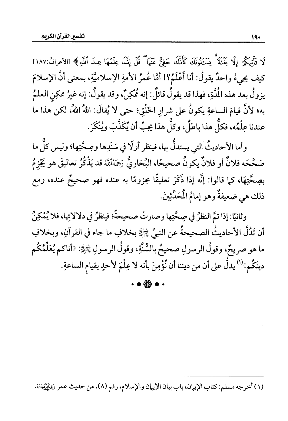 وثانيًا: إذا تمَّ النظرُ في صِحَّتِها وصارتْ صحيحةً؛ فينظرُ في دلالاتِها، فلا يُمْكِنُ أن تَدُلَّ الأحاديثُ الصحيحةُ عن النبيِّ - صلى الله عليه وسلم - بخلافِ ما جاء في القرآنِ، وبخلافِ ما هو صريحٌ، وقولُ الرسولِ صحيحٌ بالسُّنَّةِ، وقولُ الرسولِ - صلى الله عليه وسلم -: "أتاكم يُعَلِّمُكُم دينَكُم" (¬١) يدلُّ على أن من ديننا أن نُؤْمِنَ بأنه لا عِلْمَ لأحدٍ بقيامِ الساعةِ.
