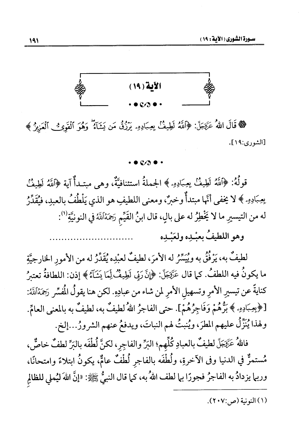 قولُهُ: {اللَّهُ لَطِيفٌ بِعِبَادِهِ} الجملةُ استئنافيَّةٌ، وهي مبتدأٌ آية {اللَّهُ لَطِيفٌ بِعِبَادِهِ} لا يخفى أنَّها مبتدأٌ وخبرٌ، ومعنى اللطيفِ هو الذي يَلْطُفُ بالعبدِ، فيُقَدِّرُ له من التيسيرِ ما لا يَخْطِرُ له على بالٍ، قال ابنُ القَيِّمِ رَحِمَهُ اللَّهُ في النونيَّةِ (¬١):