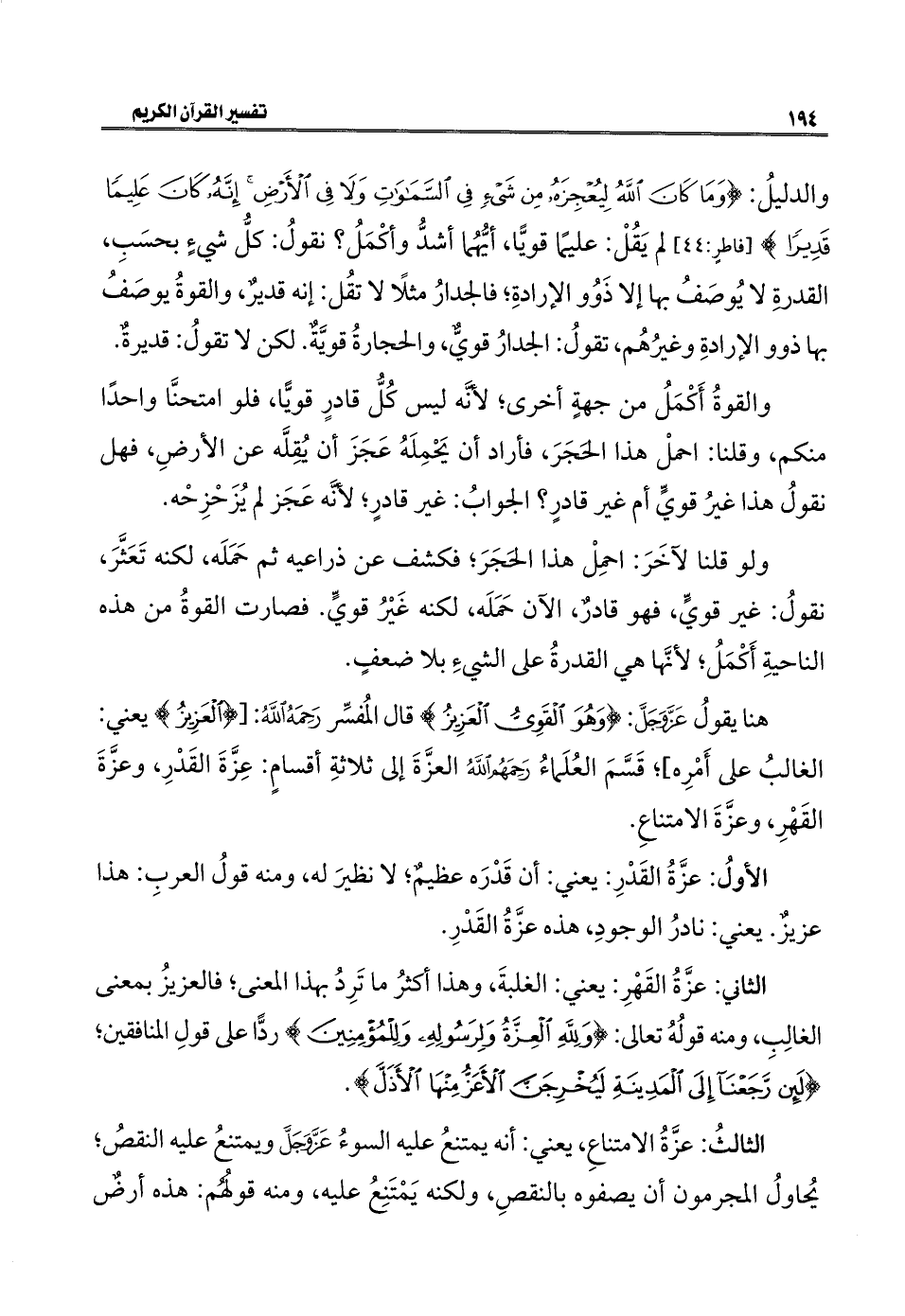 هنا يقولُ عَزَّ وَجَلَّ: {وَهُوَ الْقَوِيُّ الْعَزِيزُ} قال المُفسِّر رَحِمَهُ اللَّهُ: [{الْعَزِيزُ} يعني: الغالبُ على أَمْرِه]؛ قَسَّمَ العُلَماءُ رَحَمَهُم اللَّهُ العزَّةَ إلى ثلاثةِ أقسامٍ: عِزَّةَ القَدْرِ، وعزَّةَ القَهْرِ، وعزَّةَ الإمتناعِ.