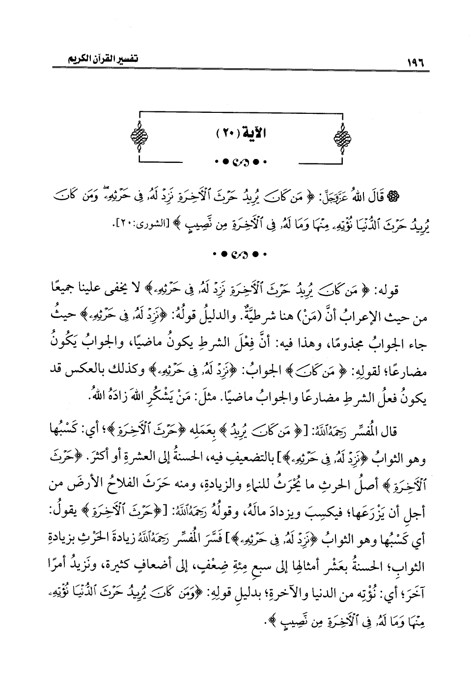 قال المُفسِّر رَحِمَهُ اللَّهُ: [{مَنْ كَانَ يُرِيدُ} بِعَمَلِه {حَرْثَ الْآخِرَةِ}؛ أي: كَسْبُها وهو الثوابُ {نَزِدْ لَهُ فِي حَرْثِهِ}] بالتضعيفِ فيه، الحسنةُ إلى العشرةِ أو أكثرَ. {حَرْثَ الْآخِرَةِ} أصلُ الحرثِ ما يُحْرَثُ للنماءِ والزيادةِ، ومنه حَرَثَ الفلاحُ الأرضَ من أجلِ أن يَزْرَعَها؛ فيكسِبَ ويزدادَ مالَهُ، وقولُهُ رَحِمَهُ اللَّهُ: [{حَرْثَ الْآخِرَةِ} يقولُ: أي كَسْبُها وهو الثوابُ {نَزِدْ لَهُ فِي حَرْثِهِ}] فَسَّرَ المُفسِّر رَحِمَهُ اللَّهُ زيادةَ الحَرْثِ بزيادةِ الثوابِ؛ الحسنةُ بعَشْر أمثالهِا إلى سبعِ مِئةِ ضِعْفٍ، إلى أضعافٍ كثيرة، ونَزيدُ أمرًا آخَرَ؛ أي: نُؤْتِه من الدنيا والآخرةِ؛ بدليلِ قولِهِ: {وَمَنْ كَانَ يُرِيدُ حَرْثَ الدُّنْيَا نُؤْتِهِ مِنْهَا وَمَا لَهُ فِي الْآخِرَةِ مِنْ نَصِيبٍ}.
