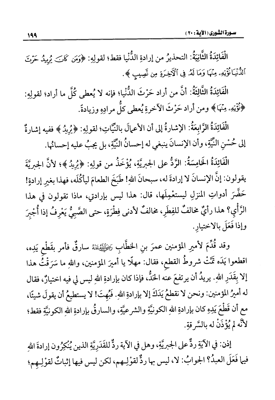وقد قُدِّمَ لأميرِ المؤمنين عمرَ بنِ الخطَّابِ - رضي الله عنه - سارقٌ فأمر بقَطْعِ يَدِه، اقطعوا يَدَه تَمَّتْ شروطُ القطعِ، فقال: مهلًا يا أميرَ المؤمنين، واللهِ ما سَرَقْتُ هذا إلا بِقَدَرِ اللهِ. يريدُ أن يرتفعَ عنه الحَدُّ، فإذا كان بإرادةِ اللهِ ليس لي فيه اختيارٌ، فقال له أميرُ المؤمنين: ونحن لا نقطعُ يَدَكَ إلا بإرادةِ اللهِ. فَبُهِتَ! لا يستطيعُ أن يقولَ شيئًا، مع أن قَطْعَ يَدهِ كان بإرادةِ اللهِ الكونيَّةِ والشرعيَّةِ، والسارقُ بإرادةِ اللهِ الكونيَّةِ فقط؛ لأنَّه لم يُؤْذَنْ له بالسَّرقةِ.