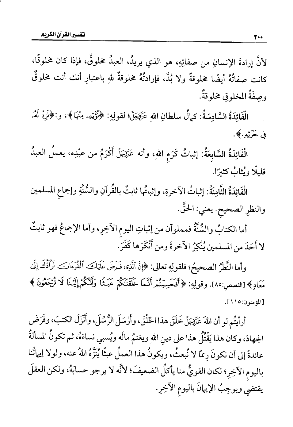الْفَائِدَةُ الثَّامِنَةُ: إثباتُ الآخرةِ، وإثباتُها ثابتٌ بالقُرآنِ والسُّنَّةِ وإجماعِ المسلمين والنظرِ الصحيحِ. يعني: الحقَّ.