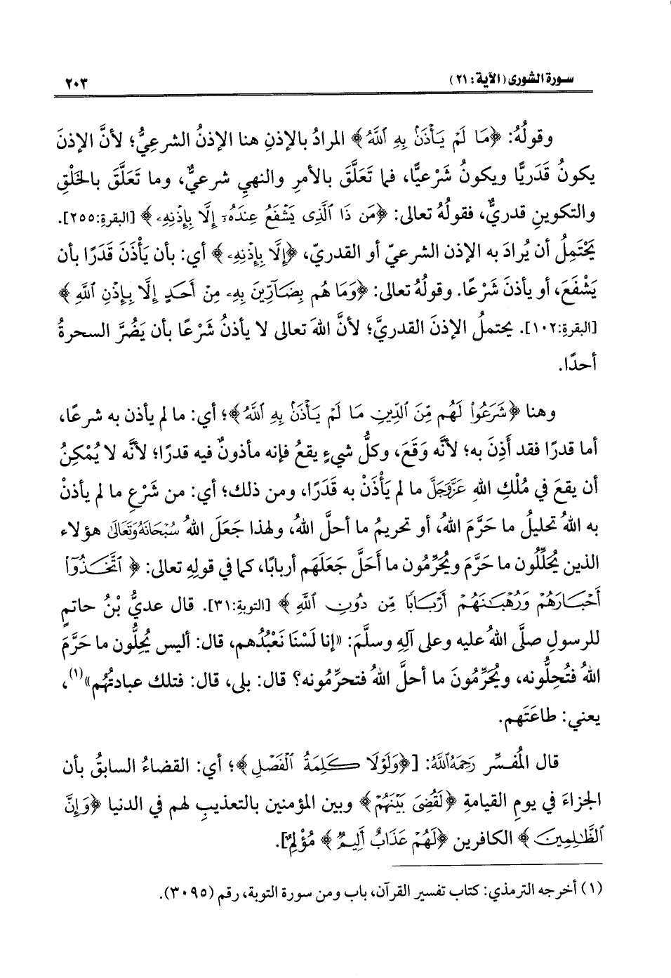 وهنا {شَرَعُوا لَهُمْ مِنَ الدِّينِ مَا لَمْ يَأْذَنْ بِهِ اللَّهُ}؛ أي: ما لم يأذن به شرعًا، أما قدرًا فقد أَذِنَ به؛ لأنَّه وَقَعَ، وكلُّ شيءٍ يقعُ فإنه مأذونٌ فيه قدرًا؛ لأنَّه لا يُمْكِنُ أن يقعَ في مُلْكِ اللهِ عَزَّ وَجَلَّ ما لم يَأْذَنْ به قَدَرًا، ومن ذلك؛ أي: من شَرْعِ ما لم يأذنْ به اللهُ تحليلُ ما حَرَّمَ اللهُ، أو تحريمُ ما أحلَّ اللهُ، ولهذا جَعَلَ اللهُ سُبْحَانَهُ وَتَعَالَى هؤلاء الذين يُحِلِّلُون ما حَرَّمَ ويُحَرِّمُون ما أَحَلَّ جَعَلَهَم أربابًا، كما في قولِهِ تعالى: {اتَّخَذُوا أَحْبَارَهُمْ وَرُهْبَانَهُمْ أَرْبَابًا مِنْ دُونِ اللَّهِ} [التوبةِ: ٣١]. قال عديُّ بْنُ حاتمٍ للرسولِ صلَّى اللهُ عليه وعلى آلِهِ وسلَّمَ: "إنا لَسْنَا نَعْبُدُهم، قال: أليس يُحِلُّون ما حَرَّمَ اللهُ فتُحِلُّونه، ويُحَرِّمُونَ ما أحلَّ اللهُ فتحرِّمُونه؟ قال: بلى، قال: فتلك عبادتُهُم" (¬١)، يعني: طاعَتَهم.