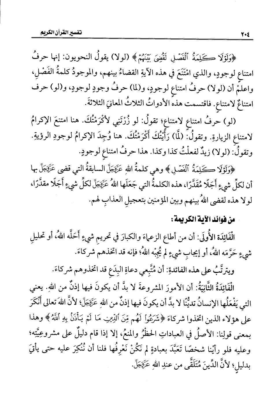 {وَلَوْلَا كَلِمَةُ الْفَصْلِ لَقُضِيَ بَيْنَهُمْ} (لولا) يقولُ النحويون: إنها حرفُ امتناعٍ لوجودٍ، والذي امْتَنَعَ في هذه الآيةِ القضاءُ بينهم، والموجودُ كلمةُ الفَصْلِ، واعلمْ أن (لولا) حرفُ امتناعٍ لوجودٍ، و (لما) حرفُ وجودٍ لوجودٍ، و (لو) حرف امتناعٌ لامتناعٍ. فاقتسمت هذه الأدواتُ الثلاثُ المعانيَ الثلاثةَ.