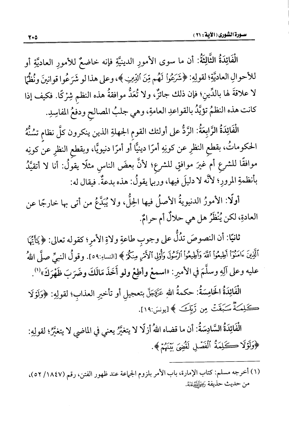 الْفَائِدَةُ الثَّالِثَةُ: أن ما سوى الأمورِ الدينيَّةِ فإنه خاضعٌ للأمورِ العاديَّةِ أو للأحوالِ العاديَّةِ؛ لقولِهِ: {شَرَعُوا لَهُمْ مِنَ الدِّينِ}، وعلى هذا لو شَرَعُوا قوانينَ ونُظُمًا لا علاقةَ لها بالدِّينِ؛ فإن ذلك جائزٌ، ولا تُعَدُّ موافقةُ هذه النظمِ شرْكًا. فكيف إذا كانت هذه النظمُ تؤيَّدُ بالقواعدِ العامةِ، وهي جلبُ المصالحِ ودفعُ المفاسِدِ.