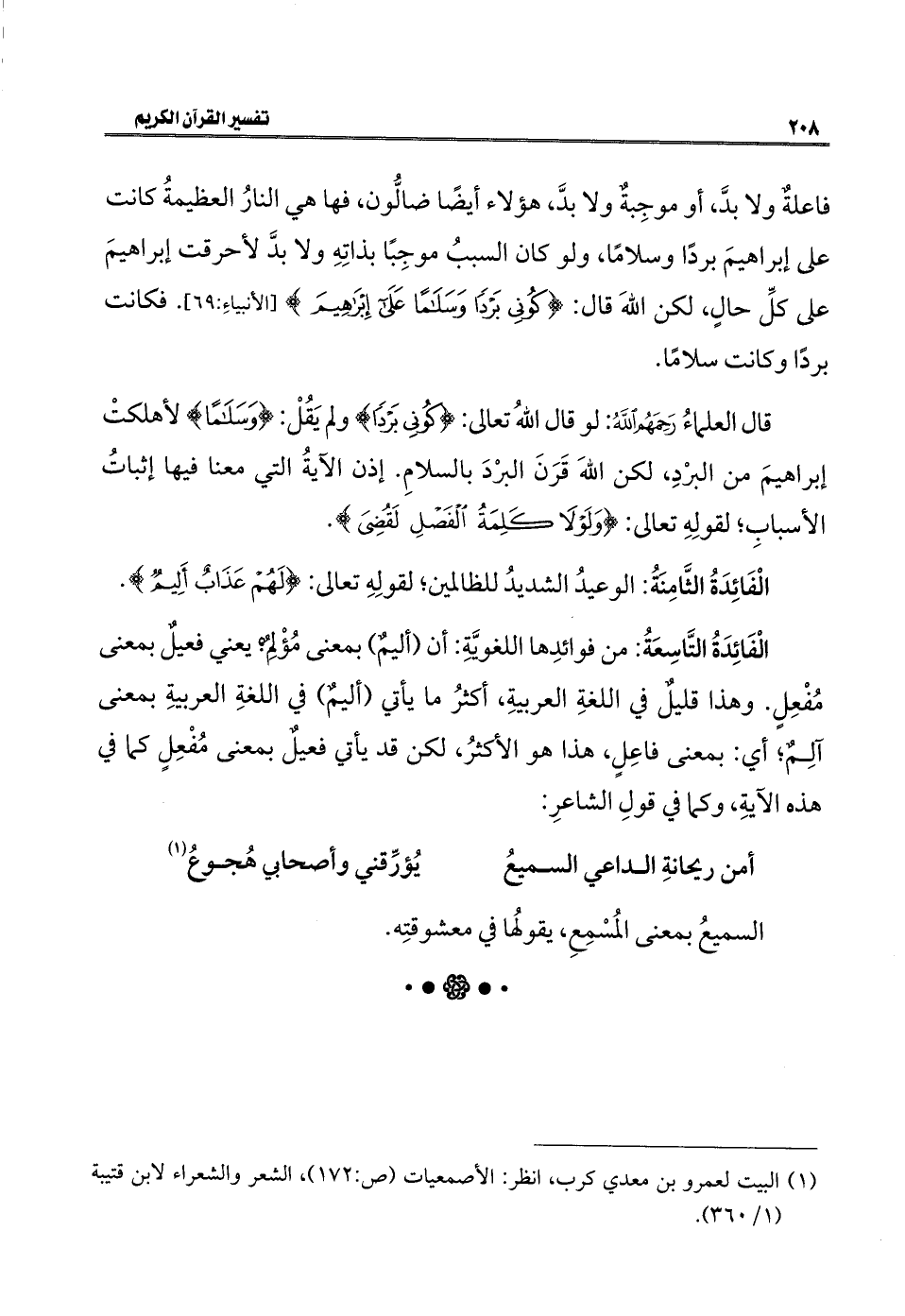 الْفَائِدَةُ التَّاسِعَةُ: من فوائدِها اللغويَّةِ: أن (أليمٌ) بمعنى مُؤْلِمٌ؛ يعني فعيلٌ بمعنى مُفْعِلٍ. وهذا قليلٌ في اللغةِ العربيةِ، أكثرُ ما يأتي (أليمٌ) في اللغةِ العربيةِ بمعنى آلِمٌ؛ أي: بمعنى فاعِلٍ، هذا هو الأكثرُ، لكن قد يأتي فعيلٌ بمعنى مُفْعِلٍ كما في هذه الآيةِ، وكما في قولِ الشاعرِ: