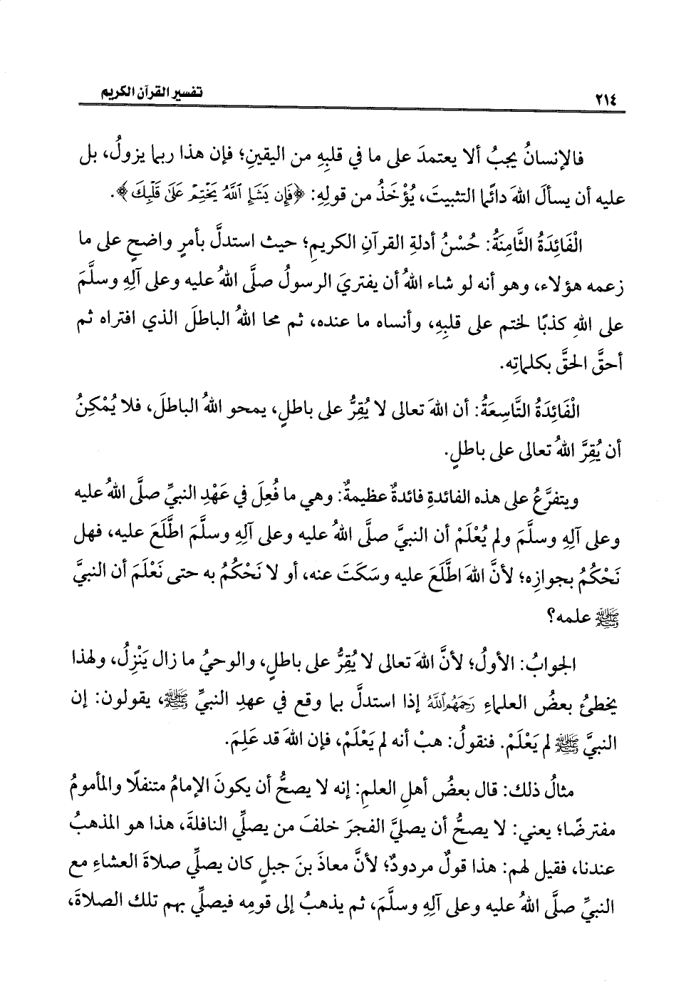 الْفَائِدَةُ التَّاسِعَةُ: أن اللهَ تعالى لا يُقِرُّ على باطلٍ، يمحو اللهُ الباطلَ، فلا يُمْكِنُ أن يُقِرَّ اللهُ تعالى على باطلٍ.