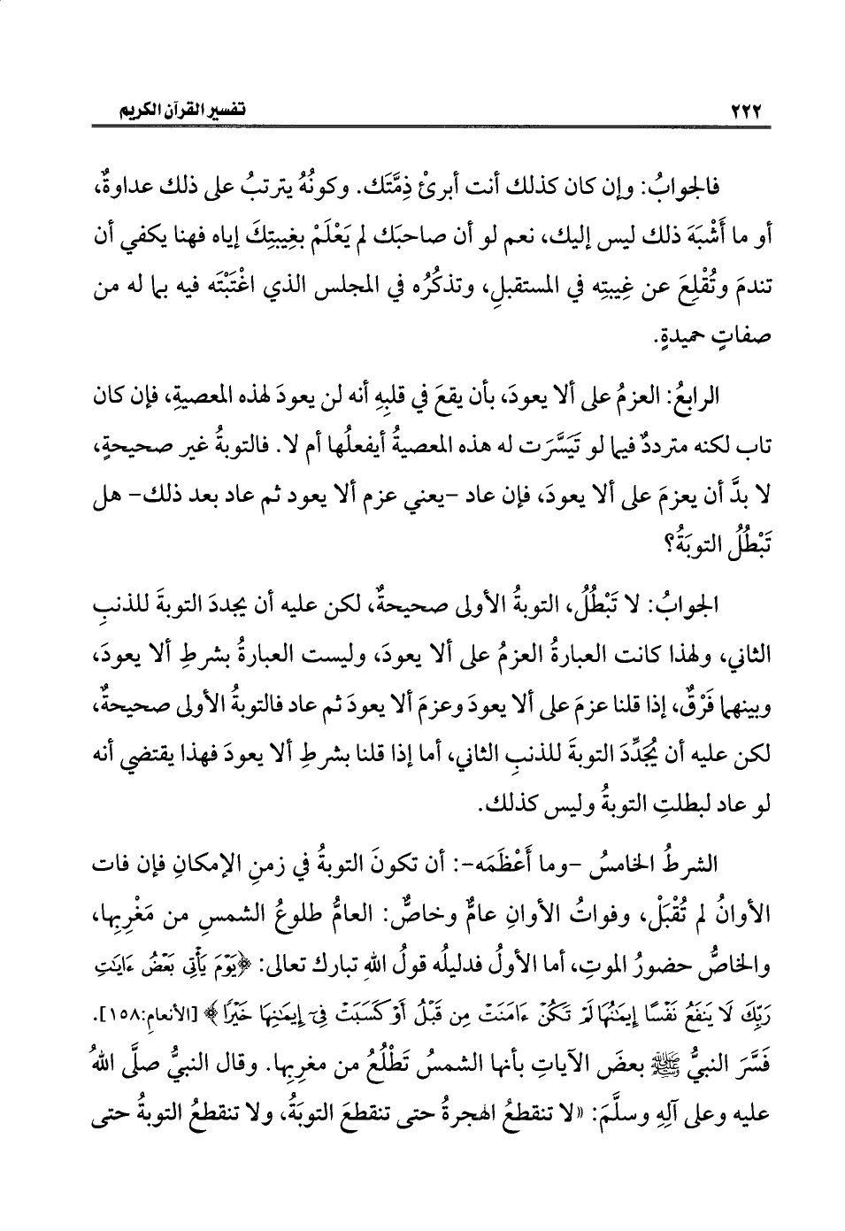 الشرطُ الخامسُ - وما أَعْظَمَه -: أن تكونَ التوبةُ في زمنِ الإمكانِ فإن فات الأوانُ لم تُقْبَلْ، وفواتُ الأوانِ عامٌّ وخاصٌّ: العامُّ طلوعُ الشمسِ من مَغْرِبِها، والخاصُّ حضورُ الموتِ، أما الأولُ فدليلُه قولُ اللهِ تبارك تعالى: {يَوْمَ يَأْتِي بَعْضُ آيَاتِ رَبِّكَ لَا يَنْفَعُ نَفْسًا إِيمَانُهَا لَمْ تَكُنْ آمَنَتْ مِنْ قَبْلُ أَوْ كَسَبَتْ فِي إِيمَانِهَا خَيْرًا} [الأنعامِ: ١٥٨]. فَسَّرَ النبيُّ - صلى الله عليه وسلم - بعضَ الآياتِ بأنها الشمسُ تَطْلُعُ من مغرِبِها. وقال النبيُّ صلَّى اللهُ عليه وعلى آلِهِ وسلَّمَ: "لا تنقطعُ الهجرةُ حتى تنقطعَ التوبَةُ، ولا تنقطعُ التوبةُ حتى