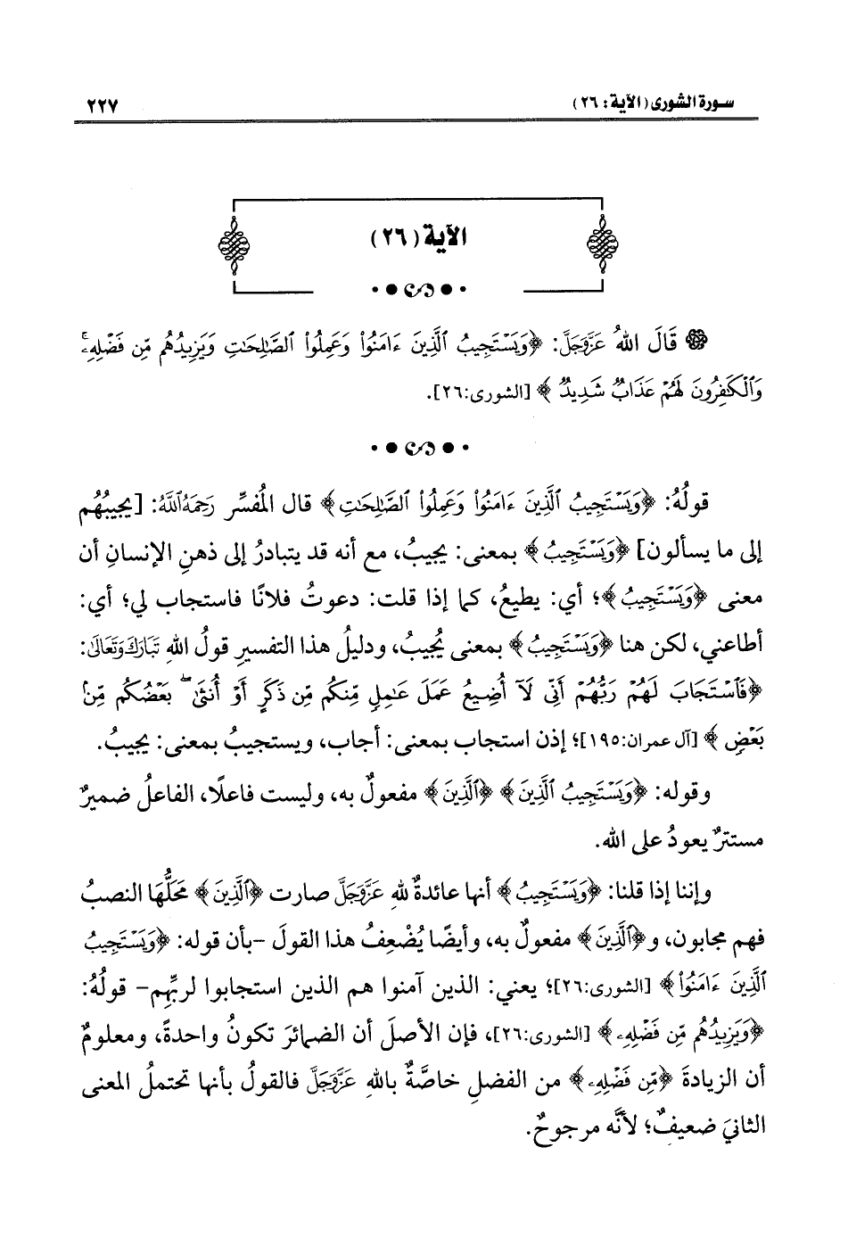 وإننا إذا قلنا: {وَيَسْتَجِيبُ} أنها عائدةٌ للهِ عَزَّ وَجَلَّ صارت {الَّذِينَ} مَحَلُّهَا النصبُ فهم مجابون، و {الَّذِينَ} مفعولٌ به، وأيضًا يُضْعِفُ هذا القولَ - بأن قوله: {وَيَسْتَجِيبُ الَّذِينَ آمَنُوا} [الشورى: ٢٦]، يعني: الذين آمنوا هم الذين استجابوا لربِّهِم - قولُهُ: {وَيَزِيدُهُمْ مِنْ فَضْلِهِ} [الشورى: ٢٦]، فإن الأصلَ أن الضمائرَ تكونُ واحدةً، ومعلومٌ أن الزيادةَ {مِنْ فَضْلِهِ} من الفضلِ خاصَّةٌ باللهِ عَزَّ وَجَلَّ فالقولُ بأنها تحتملُ المعنى الثانيَ ضعيفٌ؛ لأنَّه مرجوحٌ.