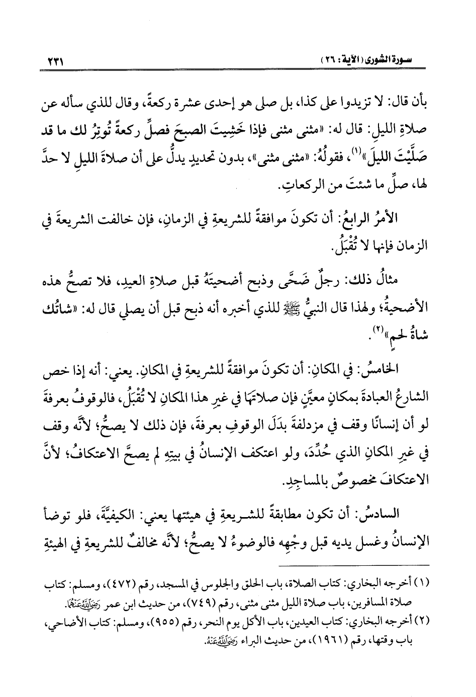 الأمرُ الرابعُ: أن تكونَ موافقةً للشريعةِ في الزمانِ، فإن خالفت الشريعةَ في الزمان فإنها لا تُقْبَلُ.