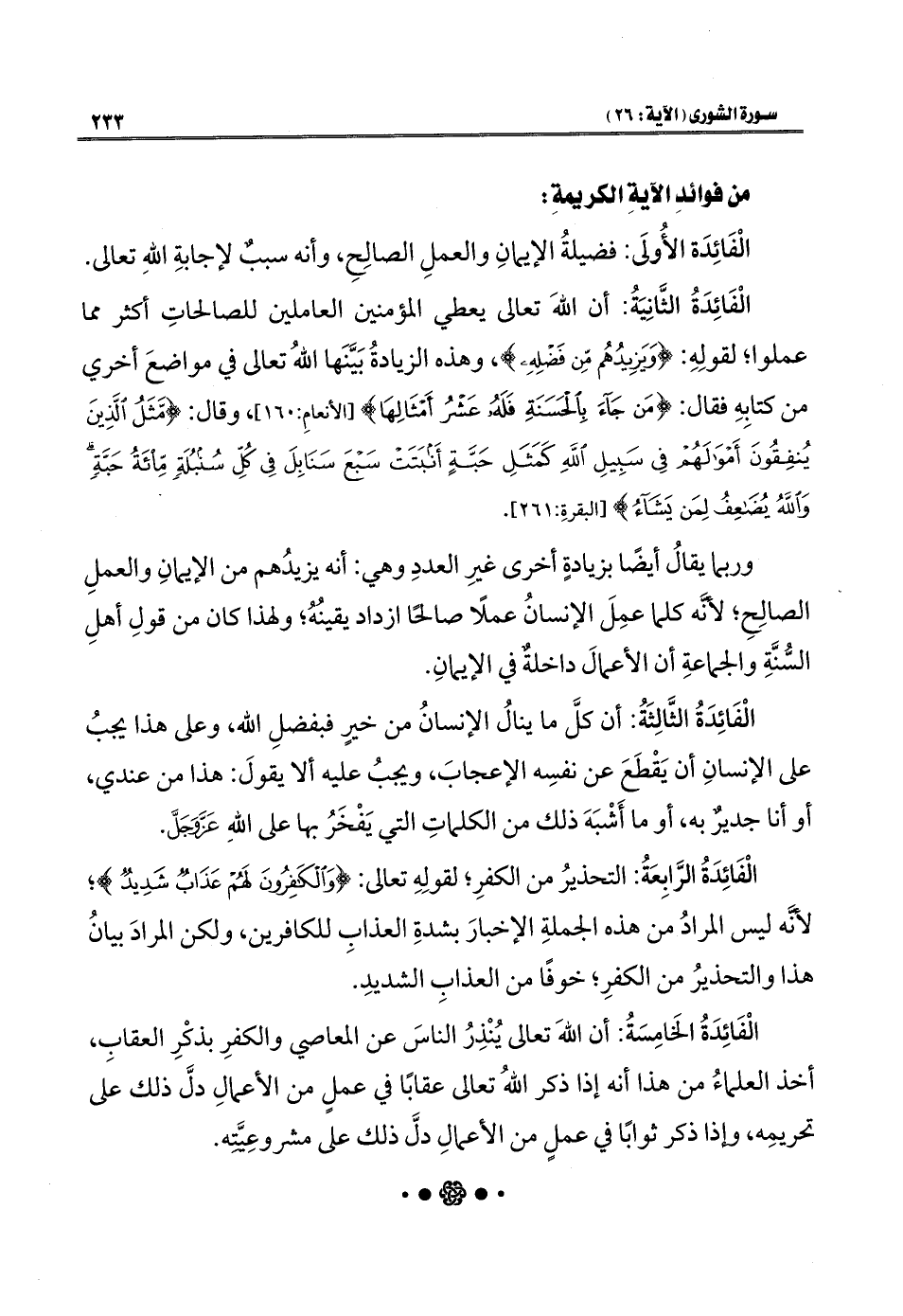 الْفَائِدَةُ الثَّانِيَةُ: أن اللهَ تعالى يعطي المؤمنين العاملين للصالحاتِ أكثر مما عملوا؛ لقولِهِ: {وَيَزِيدُهُمْ مِنْ فَضْلِهِ}، وهذه الزيادةُ بَيَّنَها اللهُ تعالى في مواضعَ أخرى من كتابِهِ فقال: {مَنْ جَاءَ بِالْحَسَنَةِ فَلَهُ عَشْرُ أَمْثَالِهَا} [الأنعامِ: ١٦٠]، وقال: {مَثَلُ الَّذِينَ يُنْفِقُونَ أَمْوَالَهُمْ فِي سَبِيلِ اللَّهِ كَمَثَلِ حَبَّةٍ أَنْبَتَتْ سَبْعَ سَنَابِلَ فِي كُلِّ سُنْبُلَةٍ مِائَةُ حَبَّةٍ وَاللَّهُ يُضَاعِفُ لِمَنْ يَشَاءُ} [البقرةِ: ٢٦١].