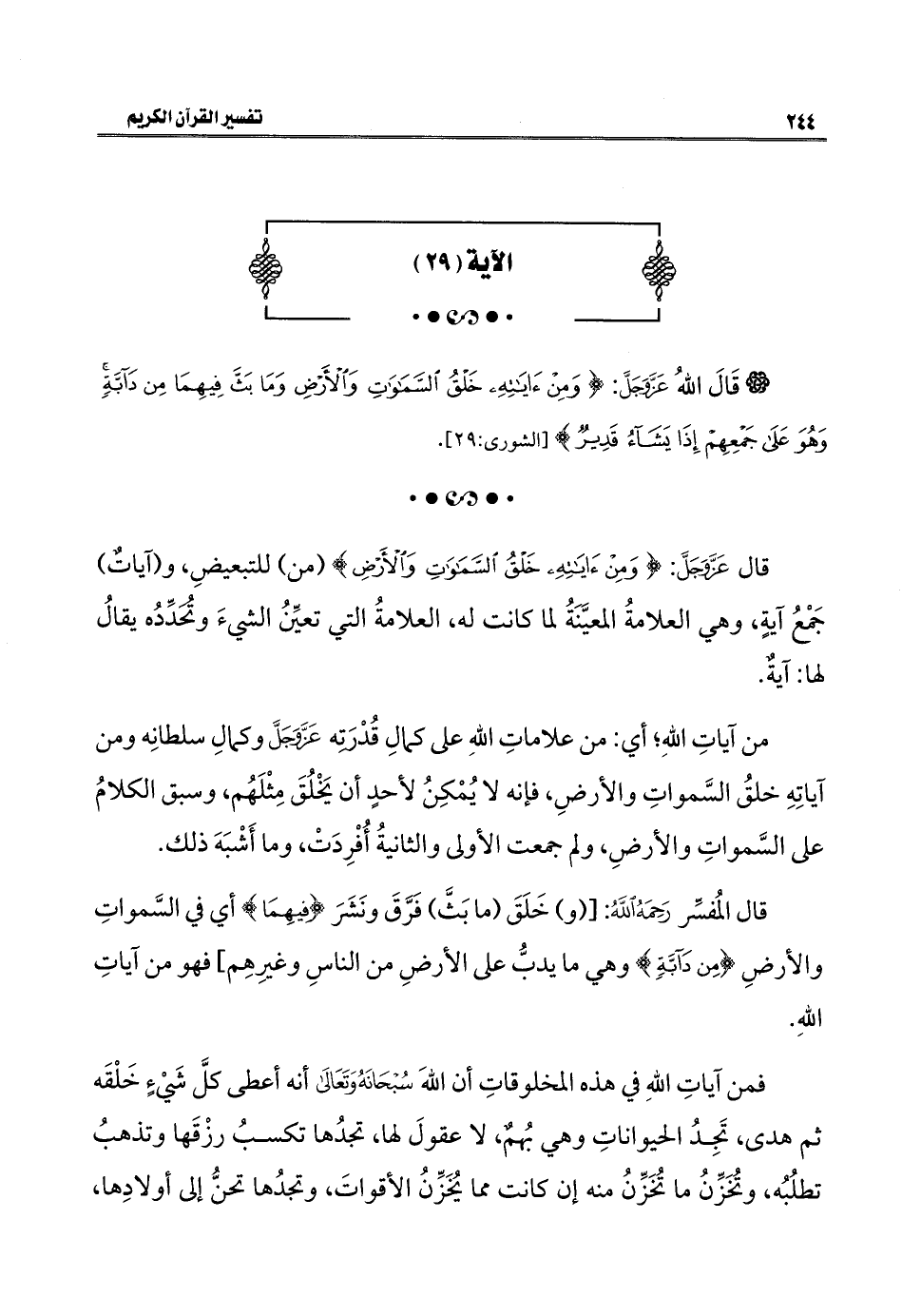 قال المُفسِّر رَحِمَهُ اللَّهُ: [(و) خَلَقَ (ما بَثَّ) فَرَّقَ ونَشَرَ {فِيهِمَا} أي في السَّمواتِ والأرضِ {مِنْ دَابَّةٍ} وهي ما يدبُّ على الأرضِ من الناسِ وغيرِهِم] فهو من آياتِ اللهِ.