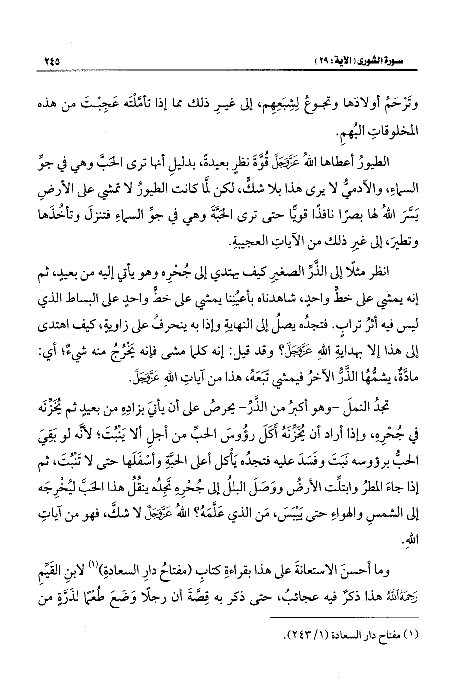 وما أحسنَ الإستعانةَ على هذا بقراءةِ كتابِ (مفتاحُ دارِ السعادةِ) (¬١) لابنِ القَيِّمِ رَحِمَهُ اللَّهُ هذا ذكرٌ فيه عجائبُ، حتى ذكر به قِصَّةَ أن رجلًا وَضَعَ طُعْمًا لذَرَّةٍ من