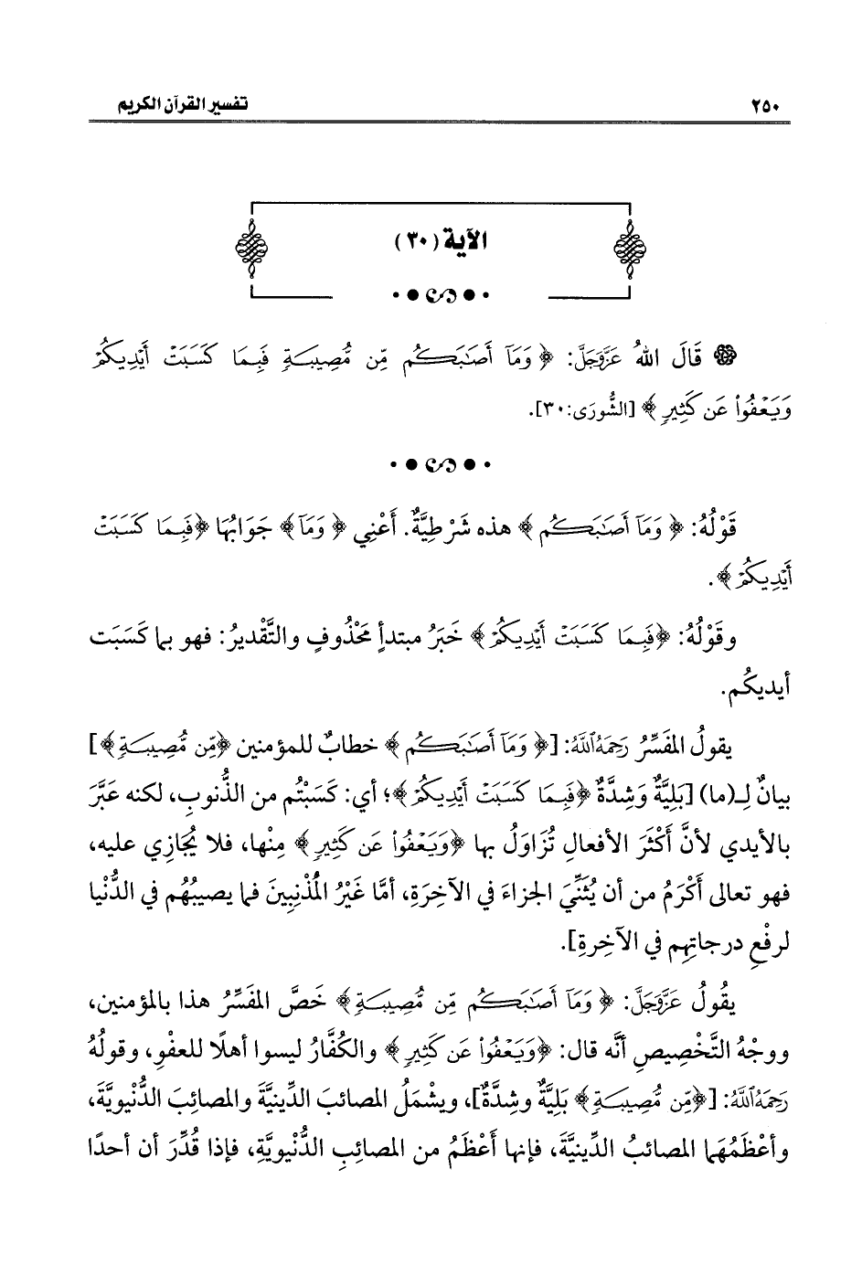 يقُولُ عَزَّ وَجَلَّ: {وَمَا أَصَابَكُمْ مِنْ مُصِيبَةٍ} خَصَّ المفَسِّرُ هذا بالمؤمنين، ووجْهُ التَّخْصِيصِ أنَّه قال: {وَيَعْفُو عَنْ كَثِيرٍ} والكُفَّارُ ليسوا أهلًا للعفْوِ، وقولُهُ رَحِمَهُ اللَّهُ: [{مِنْ مُصِيبَةٍ} بَلِيَّةٌ وشِدَّةٌ]، ويشْمَلُ المصائبَ الدِّينيَّةَ والمصائِبَ الدُّنْيويَّةَ، وأعْظَمُهَما المصائبُ الدِّينيَّةَ، فإنها أَعْظَمُ من المصائِبِ الدُّنْيويَّةِ، فإذا قُدِّرَ أن أحدًا