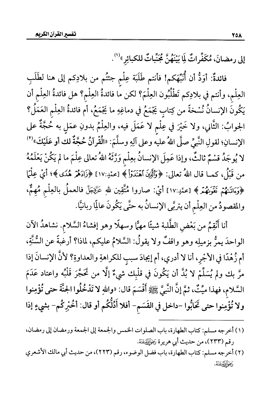 فائدةٌ: أوَدُّ أن أُنَبِّهَكم! فأنتم طَلَبَة عِلْمٍ جئتُم من بلادِكم إلى هنا لطَلَبِ العِلْمِ، وأنتم في بلادِكم تَطْلُبُون العِلْمَ؟ لكن ما فائدةُ العِلْمِ؟ هل فائدةُ العِلْمِ أن يَكُونَ الإنسانُ نُسْخةً من كِتابٍ يَجْمَعُ في دماغِهِ ما يَجْمَعُ، أم فائدةُ العِلْمِ العَمَلُ؟ الجوابُ: الثَّاني، ولا خَيْرَ في عِلْمٍ لا عَمَلَ فيه، والعِلْمُ بدونِ عمَلٍ به حُجَّةٌ على الإنسانِ؛ لقولِ النَّبيِّ صلى اللهُ عليه وعلى آلِهِ وسلَّمَ: "الُقْرآنُ حُجَّةٌ لك أو عَلَيْكَ" (¬٢) لا يُوجَدُ قسْمٌ ثالثٌ، وإذا عَمِلَ الإنسانُ بعِلْمٍ وَرَّثَهُ اللهُ تعالى عِلْمَ ما لم يَكُنْ يَعْلَمُهُ من قَبْلُ، كما قال اللهُ تعالى: {وَالَّذِينَ اهْتَدَوْا} [محمَّدٍ: ١٧] {زَادَهُمْ هُدًى}؛ أيْ عِلْمًا {وَآتَاهُمْ تَقْوَاهُمْ} [محمَّدٍ: ١٧] أيْ: صاروا مُتَّقِين للهِ عَزَّ وَجَلَّ فالعملُ بالعِلْمِ مُهِمٌّ، والمقصودُ من العِلْمِ أن يتربَّى الإنسانُ به حتَّى يَكُونَ عالِمًا ربانيًّا.