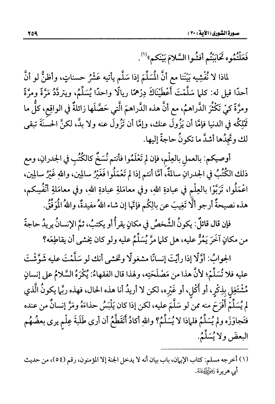 لماذا لا نُفْشِيه بَيْنَنا مع أنَّ المُسَلِّمَ إذا سَلَّم يأتيه عَشْرُ حسناتٍ، وأظنُّ لو أنَّ أحدًا قيل له: كلما سَلَّمْتَ أَعْطَيْنَاكَ دِرْهمًا ريالًا واحدًا يُسَلِّمُ، ويتردَّدُ مَرَّةً ومرَّةً ومرَّةً كيْ تَكْثُرَ الدَّراهمُ، مع أنَّ هذه الدَّراهمَ الَّتي حَصَّلَها زائلةٌ في الواقِعِ، كلُّ ما تَمْلِكُه في الدنيا فإمَّا أن يَزُولَ عنك، وإمَّا أن تَزُولَ عنه ولا بدَّ، لكنَّ الحسنَةَ تبقى لك وتَجِدُها أشدَّ ما تكونُ حاجةً إليها.